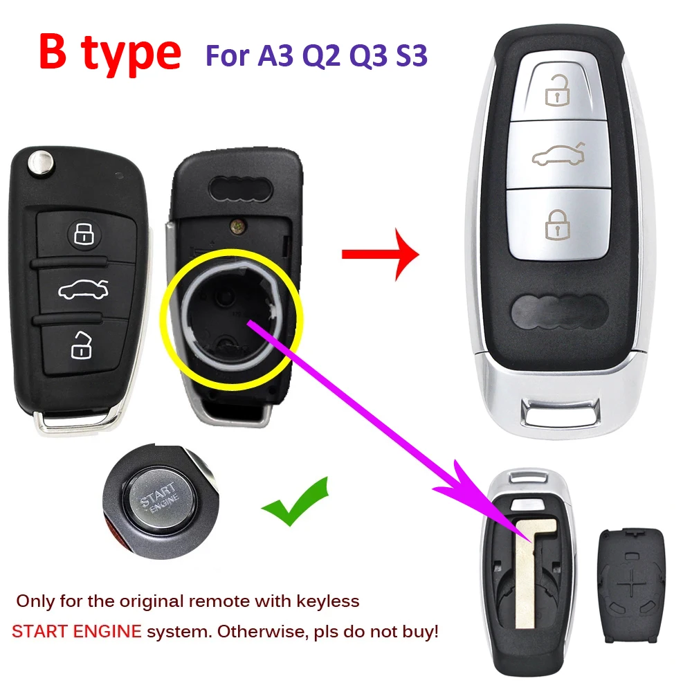 Модифицированный дистанционный автомобильный чехол для ключей, чехол для смарт-ключей без ключа, чехол для Audi A4 A6 Q7 TT A3 Q3 R3 Q2 S3 RS3