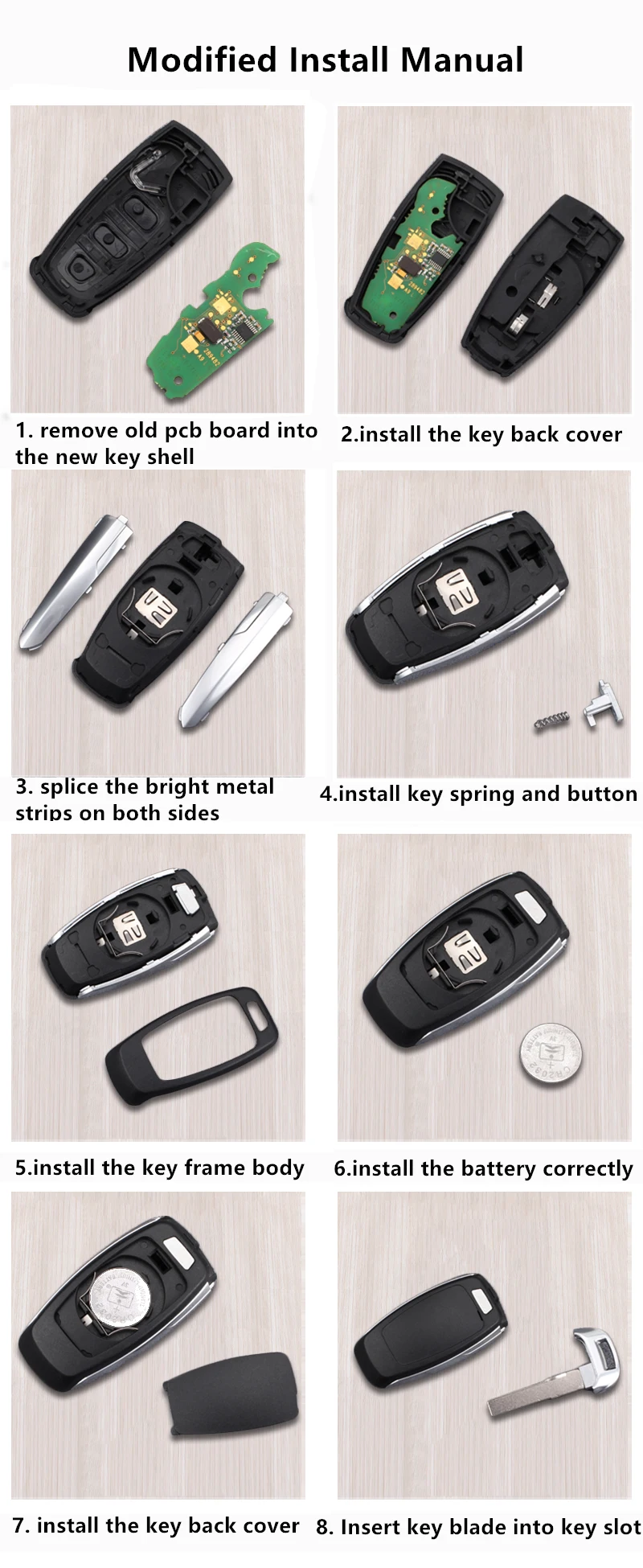 Примечание: 1. Пожалуйста, убедитесь, что ваш собственный ключ точно такой же, как на наших фотографиях, В противном случае этот продукт не является лучшим выбором. 2. Лезвие ключа необходимо отрезать у вашего местного дилера или квалифицированного слесаря. 3. Все, что вам нужно сделать, это перенести внутренние компоненты с вашего старого пульта на наш новый чехол. 4. Внутри нет внутренней части (пульт дистанционного управления/электроника/транспондер/аккумулятор). 5. Программа не требуется.