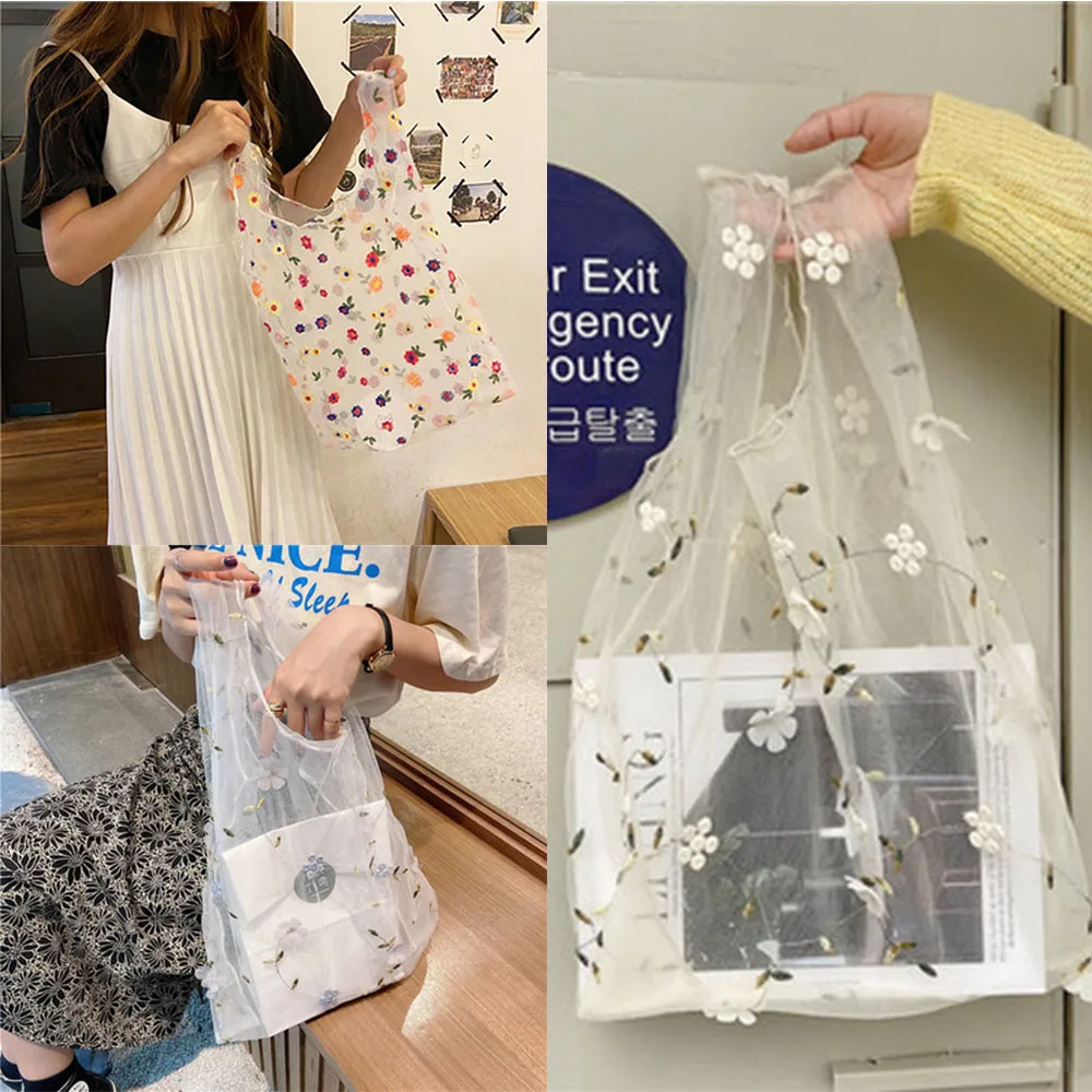 Женская Сетчатая Сумка-тоут из органзы, с цветочной вышивкой