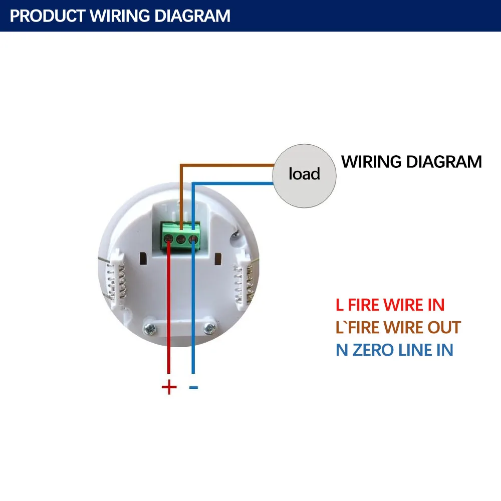 Провод под напряжением и нейтральный провод источника питания переменного тока 110-240 В подключены к розеткам L и N индукционного переключателя (при строгом различии, L-образный разъем подключен к проводу питания под напряжением, а N-к нейтральному проводу, и он работает нормально без различий), свет (Или другие электрические приборы) Подключите к розеткам L'and N сенсорного переключателя (обратите внимание, что розетка N-это общий разъем для нейтральной линии, и обратите внимание, что l'- это выходной провод под напряжением, И его необходимо подключить к светильникам или другим электроприборам)