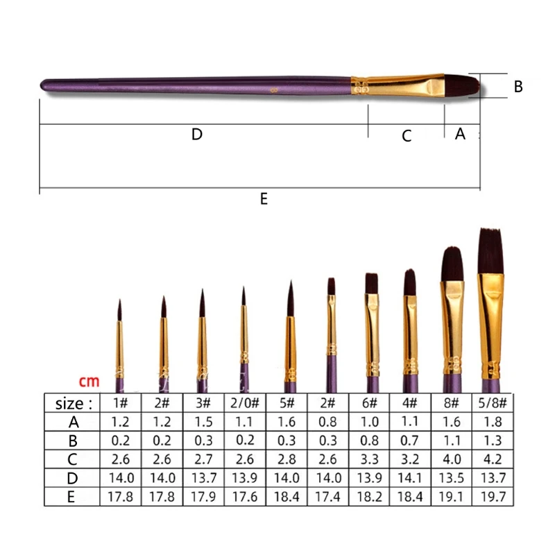 Каждый акриловый набор кистей для рисования для художника содержит 10 размеров: 2/0 1 2 3 5 2 4 6 8 5/8. Длина каждой кисти для рисования: