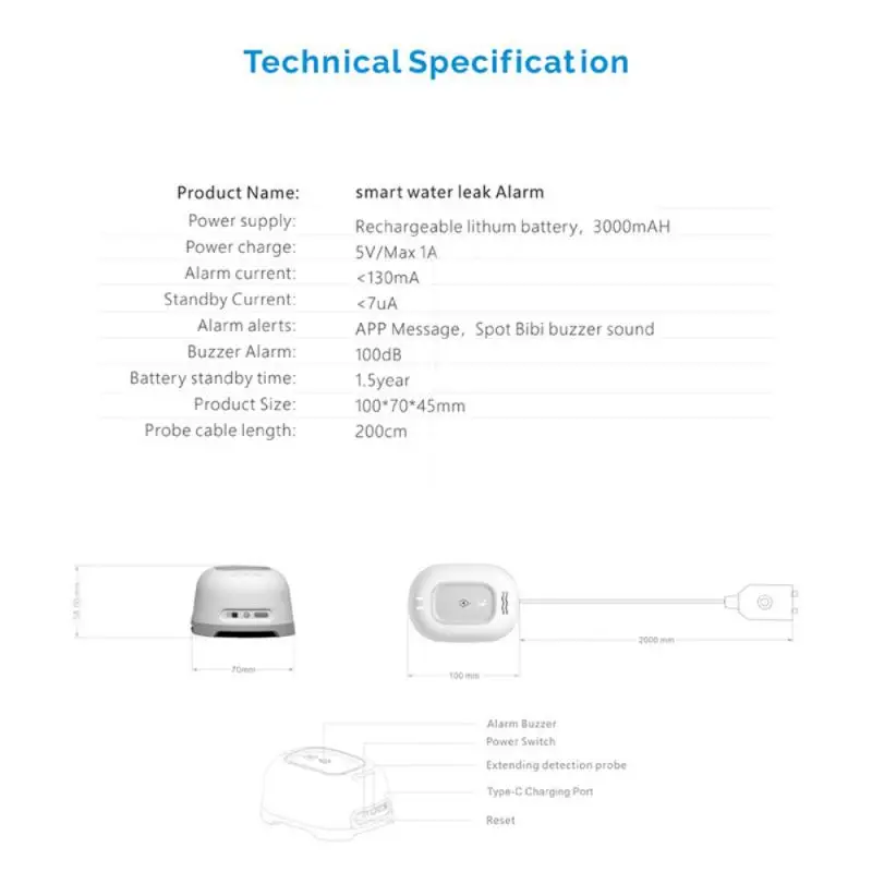 Этот сигнал обнаружения воды может похвастаться громким и мощным сигналом 90 дБ, который будет звучать мгновенно, если вода мостов между устройствами два контакта, а также генерировать оповещения тревоги в вашем мобильном приложении.