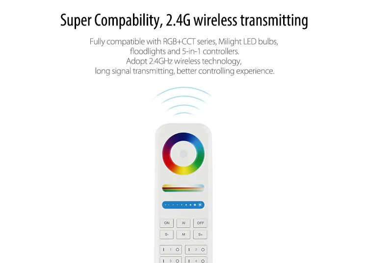 Название продукта: 4 зоны RGB + CCT пульт дистанционного управленияНомер модели:FUT092Рабочая температура: -20 -60 ℃Напряжение: 3 в (2 * AAA батареи)Частота передачи: 2400-2483,5 МГцМетод модуляции: GFSKМощность передачи: 6 дБмРасстояние управления: 30 мМощность в режиме ожидания: 30uAРазмер: 56*20*138 мм