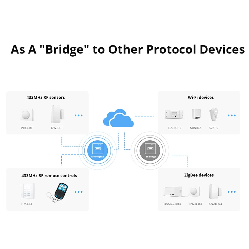 Этот RF BridgeR2 433 может преобразовать большинство радиочастотных пультов 433,92 МГц в беспроводную сеть Wi-Fi. Добавив беспроводной мост RF к приложению iOS/Android eWeLink Wi-Fi по беспроводной сети, вы можете добавить до 16 RM433 RF или сигналы тревоги, а также добавить их вместе (макс. 16 элементов). Один 4 кнопки пульта дистанционного управления может научиться 4 устройств, что означает, что 64 устройствами, поддерживающими 433 МГц частота может быть добавлен в приложении через Wi-Fi/2/3/4G сети.