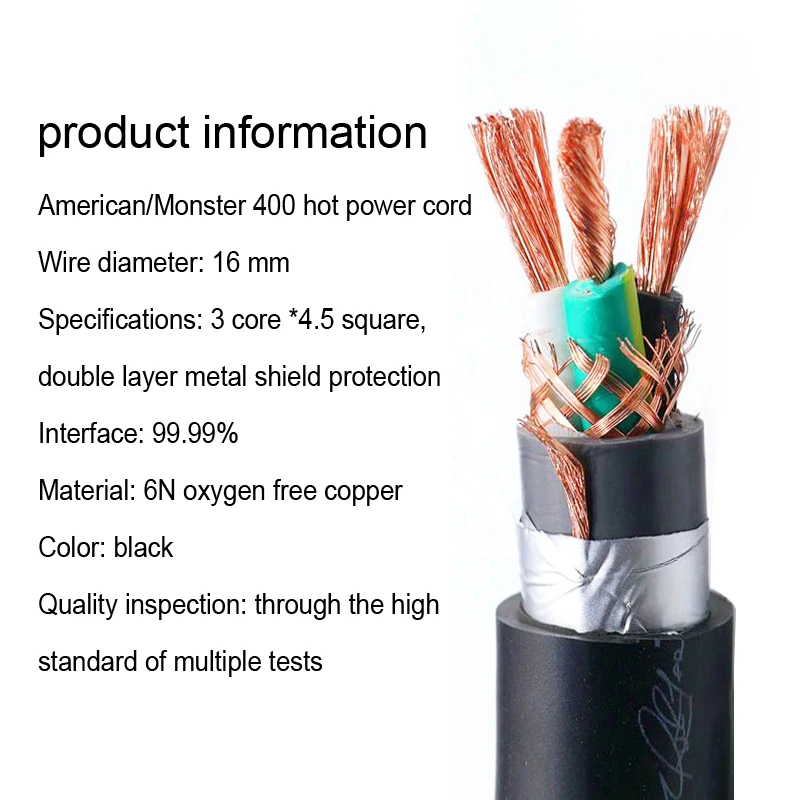 Специальная обработка зазора!($11/метр) шнур питанияТехнические параметрыДиаметр сердечника проволоки: 16 ммЭкранирование: Двухслойное экранирование из тяжелого металла● Длина 5 футов обеспечивает большую гибкость для более длинных мест.Позолоченные контакты для максимальной проводимости и устойчивости к коррозии● 100% майларовая фольга для превосходного отказа от EMI и RFIСверхвысокая производительность подключения A/V компонентов с разъемами питания IEC.Преимущества: (1) Фирменная версия шнура питания monster 400, лихорадочная двойная изоляция кожи как внутри, так и снаружи, структура двойного слоя экранирования, кожа-защитная пленка из фольги, (Металлическая фольга и более 1 пучка неизолированной проволоки между внутренней поверхностью, Облегчает подключение экрана из металлической фольги), для плетения бронзового экрана, затем три сердечника диаметром 4,5 мм, соответственно, множество нитей различной степени медной проволокиВ.Знаменитый оригинальный кабель Powerline 400 незаменим для заядлых плееровЧтобы обеспечить плавный проход большого источника питания, чтобы обеспечить вам чистый и стабильный источник питания!От поперечного сечения провода, это челюстная конструкция, три упаковки амортизирующих n независимых сердечников провода, в сочетании с кремнием резиновый изоляционный материал для наполнения, из хлопка и резины удар слой тонкой ткани между 4 n высокочистых медных сетей экранирования, Может в момент Большого источника питания Плавно проходить одновременно, обладает хорошим экранирующим эффектом, эффективно устраняет вредный звук радиочастотных помех, неудивительно, что всегда было сжигать друзей позиционирования для старшего аудио выделенный шнур питания, Полностью устраняет помехи от современной городской электросети. Звук в дополнение к средней частоте сладкий, прозрачный, текстура очень хорошая, сила низкой частоты была значительно улучшена, низкая частота сильная и мощная. Полный диапазон частот более плоский, звук более визуальный, детали более насыщенные, Звуковое поле значительно Улучшено, звуковое изображение более четкое, музыкальный фон более тихий, а эффект воспроизведения улучшен комплексно.Милый, 10-метровый шнур питания весит около 4,4 килограммов в упаковке1 корень 3 метра Вес: 1,29 кг