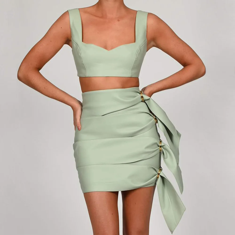 Высококачественный Женский костюм Donsignet из искусственной кожи, топ до пупка и мини-юбка, Однотонный женский модный костюм на весну и лето