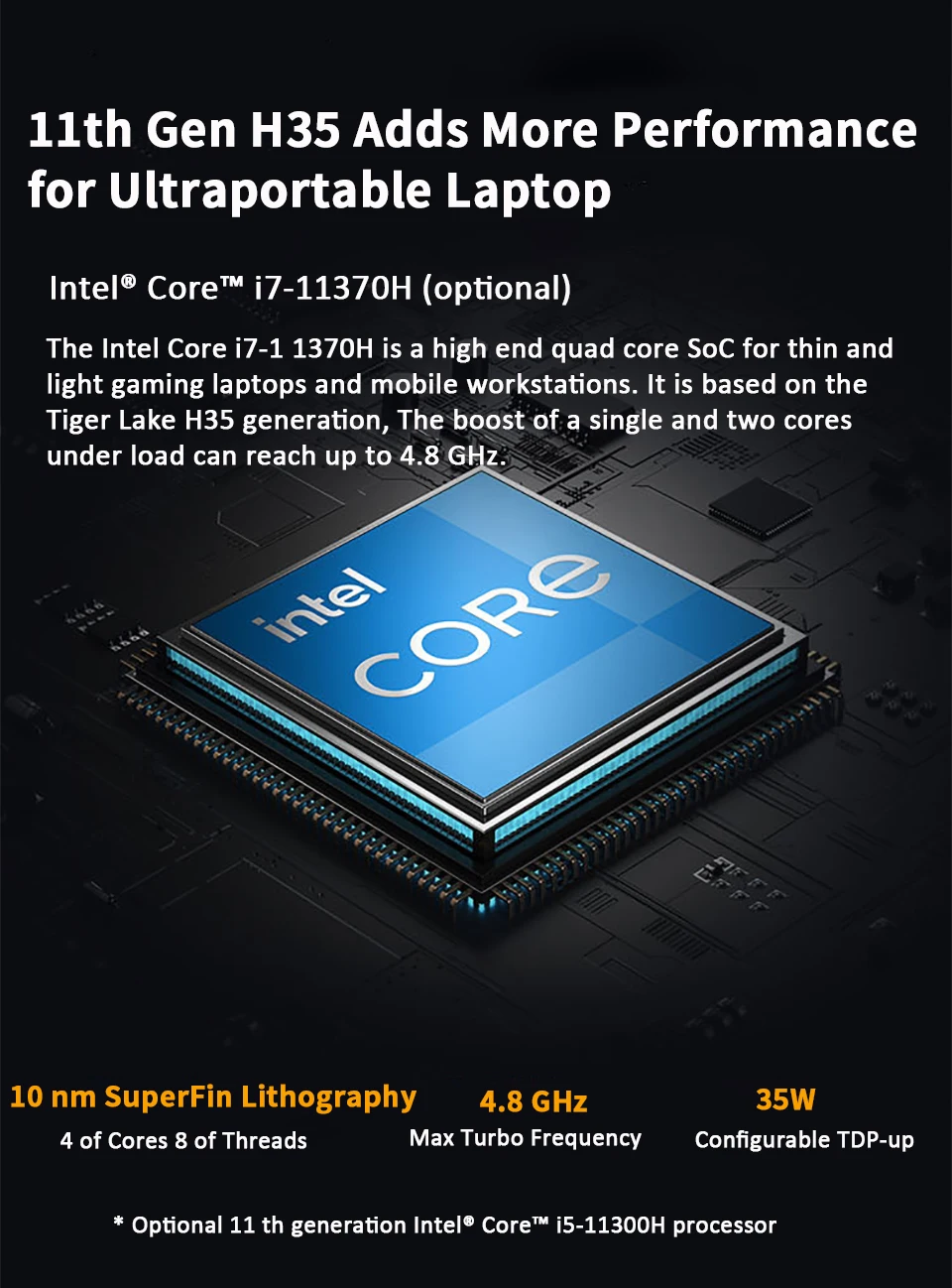 Процессор Intel Core i7-11370h 11-го поколения,Высокопроизводительная мобильная версия, стандартный ядро 3,3 ГГц,Максимальный ядро 4,8 ГГц, четырехъядерный восьмипоточный процессор,Кэш 3 уровня 12 МБ