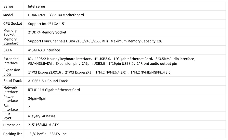 Модель: HUANANZHI B365-D4 материнская плата Гнездо процессора: Поддержка процессоров Intel LGA1151 Гнездо памяти: 2 * DDR4 гнездо памяти Стандарт памяти: Поддержка четыре канала DDR4 2133/2400/2666 МГц максимальный объем памяти объемом до 32 GB SATA:4 * SATA3.0 интерфейс Расширенный интерфейс: ввода/вывода: 1 * PS/2 интерфейс мыши/клавиатуры. 4 * USB3.0, 1 * Gigabit Ethernet карты, 3*3,5 MMAudio интерфейс VGA + совместимому с HDMI + DVI, расширение pin-код: 2 * 9pin USB2.0; 1 * 19pin USB3.0; 1 * Передние аудио выход pin-код Слоты расширения: 1 * PCI Express3.0X16 , 2 * PCI ExpressX1, 1 "M.2 NVME(x4 3,0) , 1 * M.2 NVME/NGFF(x4 3,0) Soud трек: ALC662 5,1 звуковая дорожка Сетевой интерфейс: RTL8111H Gigabit Ethernet карты Интерфейс питания: 24pin + 8pin Вентилятор интерфейс: 2 PCB ayer :4 слоя, 4 фазы Размер: 215*168 мм M-ATX
