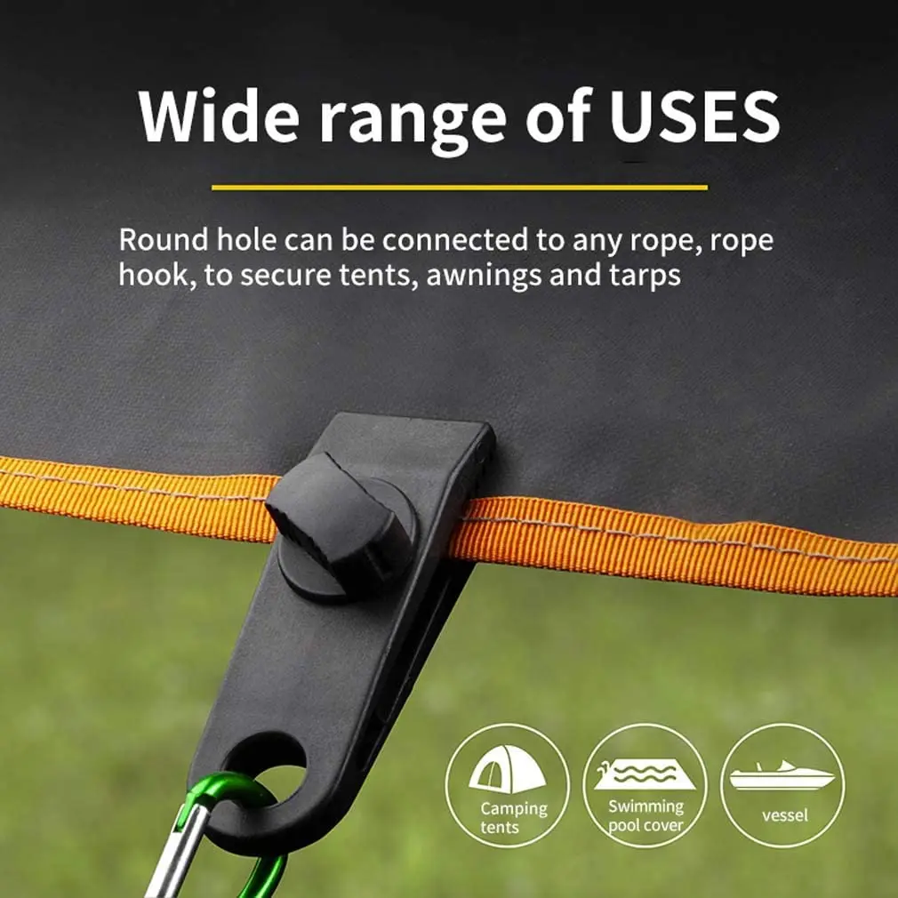 Прочный материал:Изготовлено изПрочный нейлоновый материал, водонепроницаемый и устойчивый к поломке,Вы можете использовать эти брезентовые зажимы в течение длительного времени.