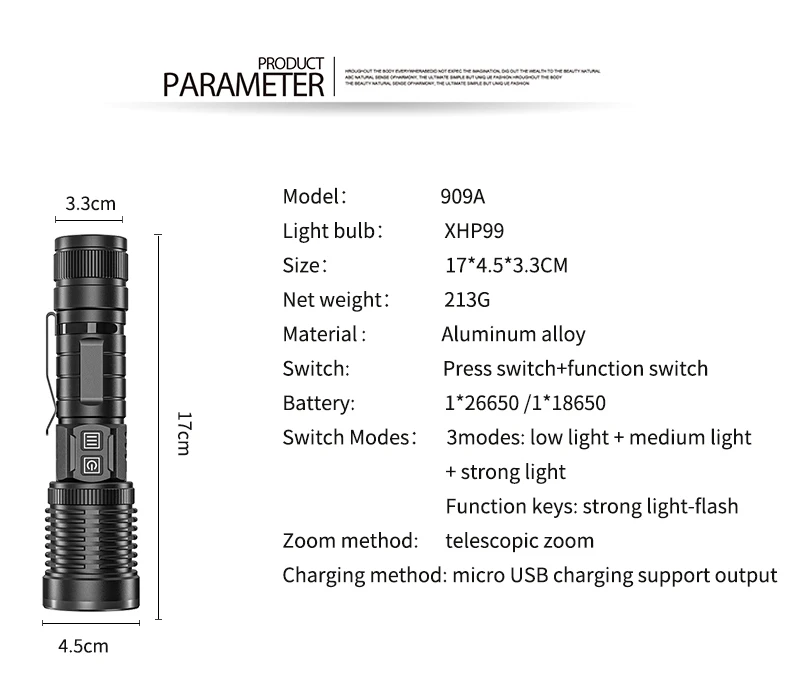 Модель: 909AЛампа-светильник: XHP99Размер изделия: 17*4,5*3,3 смВес нетто: 213 гМатериал: алюминиевый сплавПереключатель: выключатель питания + функциональный переключательАккумулятор: 1*18650/1*26650 (Не прилагаются)Способ зарядки: Поддержка micro USBРежимы: клавиша переключения 3 режима: низкий светильник + средний Светильник + сильный светильник клавиша функции: 2 режима один щелчок сильный светильник-двойной щелчок вспышки, любая передача остается более 8 секунд, одно нажатие выключениеМетод масштабирования: телескопический зумУровень водонепроницаемости: водонепроницаемыйДиапазон: >500 метровОсобенности: с держателем ручки, телескопическим зумом, высокой яркостью и большим диапазоном, двойной щелчок вспышкиСветильник индикатора: зарядный красный индикатор всегда включен, и полный синий индикатор всегда включен. ≥ 3,3 V синий светильник всегда горит, меньше, чем 3,3 V Красный светильник горит постоянно. Светильник индикатора поворачивается от синего до красного (<10%)