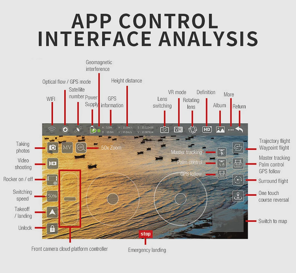 Название: Дрон SG908Датчик давления: установка высотыМотор: 1806 бесщеточный моторМощность двигателя: 1700/квРегулировка электрической мощности: 30AСпособ приема WIFI для смартфона: 5G WIFIШарнир: трехосевая Механическая самостабилизирующая головкаОбъектив: самостабилизирующий электронный анти-Вибрационный объективМакс дистанционный пульт Размер зажима для телефона: 5,5 дюймовАккумулятор пульта дистанционного управления: 1,5 V AA батарея * 4 (не прилагаются)Аккумулятор дрона: 7,6 В 3400 мАчРасстояние управления (свободное взаимодействие и отсутствие окклюзии):1200 мРасстояние передачи изображения Wi-Fi (свободное взаимодействие и отсутствие окклюзии): около 500-800 мВремя полета: около 26 минутВремя зарядки: около 6 часовUsb-зарядка: 5 ВРазмер изделия: разворачивается 32x40x8 см, складывается 18x9x8cmВес дрона: 534 гПиксель: 4K HD камераНазвание приложения: HFun PIus(IOS Android)Карданный угол (диапазон регулировки угла)110 ° автоматическое восстановление (вертикальное)65 ° автоматическое восстановление (сбоку)45 ° автоматическое восстановление (по горизонтали)Объектив камеры: регулируемая камера с помощью передатчика, 110 °GPS следуй за мной: 30 мИзображение Следуйте за мной: 1-5 мФокусное расстояние: 50xРучная съемка жестов/видеозапись: 1-5 мФронтальная камера:Разрешение видео: 2048*1080(TF)Режим SD: 1208*720 (приложение)Режим HD: 2048*1080 (приложение)Разрешение фото: 4096*3072P(TF) 4096*3072P (приложение)Нижняя Камера:Разрешение видео: 1280*720PРазрешение фото: 1280*720PЧастота кадров: 25 кадров в секундуПосылка включает в себя:1 x Квадрокоптер SG908 RC1 х пульт дистанционного управления1x2x3 7,6 V 3400mAh Lipo батарея, которую вы выбираете4 запасных пропеллера1 х USB кабель для зарядки1 отвертка8 x запасной винт1 x Руководство пользователя