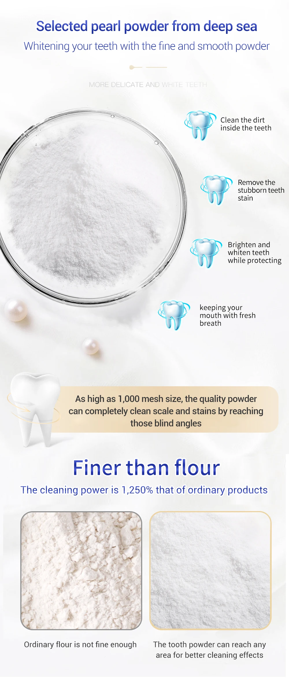 Отобранная жемчужная пудра из глубокого моря, отбеливающая зубы мелким и гладким порошком, очистите грязь внутри зубов, удалите стойкие пятна, Осветите и отбеливайте зубы, сохраняя при этом свежее дыхание размер сетки 1000, Качественный порошок может полностью очистить масштаб и пятна, достигнув тех слепых углов тоньше, чем мука мощность очистки составляет 1,250% от обычных продуктов Обычная мука не является тонкой enoug зубной порошок может достичь любой области для лучшие эффекты очистки