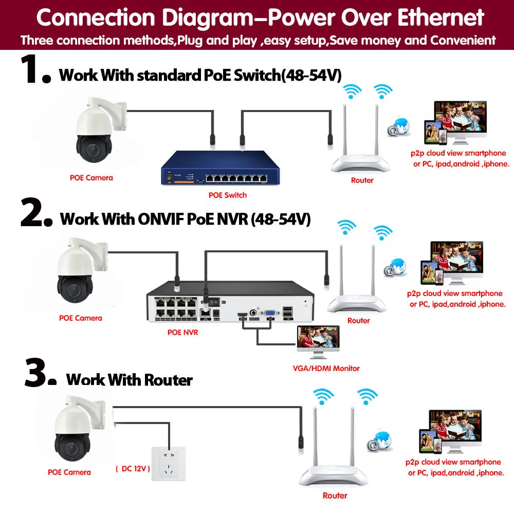 Нет дополнительных кабелей питания или адаптеров, просто подключив ip-камеру к NVR с помощью одного кабеля, вы можете легко завершить установку без знания о компьютере или сети и начать наслаждаться супер простым мониторингом среди вашего смартфона, планшета или ПК.