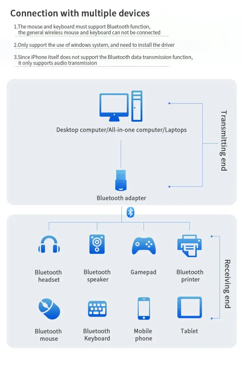 3. Только один bluetooth-адаптер может быть подключен к bluetooth-гарнитуре, мыши, клавиатуре, геймпаду, принтеру и т. д. в то же время, поддержка нескольких устройств для одновременного подключения, попрощайтесь с окантовками кабелей и проблемами с недостаточным количеством usb-портов для подключения нескольких устройств