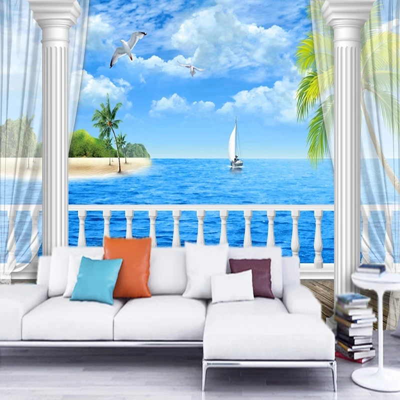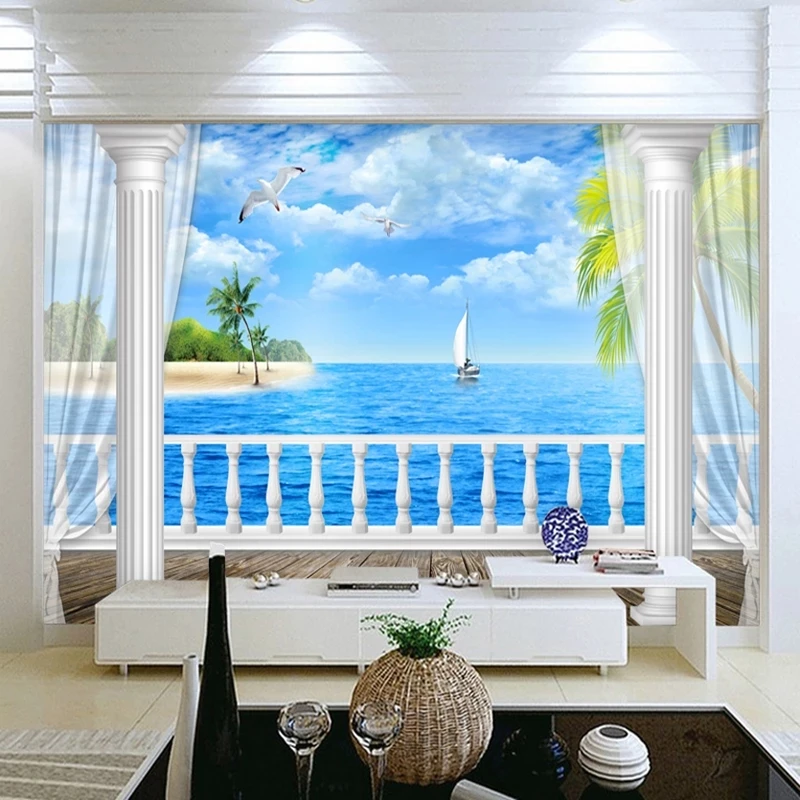Фотообои на заказ, самоклеящиеся 3D-обои HD с изображением моря, балкона, Римской колонны, современной гостиной, дивана, телевизора