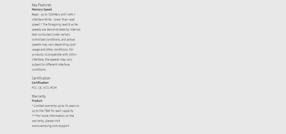 Вышеуказанные скорости чтения и записи подтверждаются тестированием, проводимым в определенных контролируемых условиях, а фактическая скорость может варьироваться в зависимости от использования и других условий. Для устройств, несовместимых с интерфейсом UHS-I, скорость может варьироваться в зависимости от условий интерфейса.