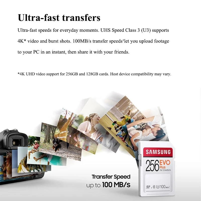 * Поддержка 4K UHD видео для карт 256 ГБ и 128 ГБ. Совместимость хост-устройств может отличаться.