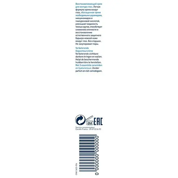 CeraVe Восстанавливающий крем для контура вокруг глаз с ультра-легкой формулой деликатно увлажняет область вокруг глаз, снижая видимость мешков и темных кругов под глазами. Предотвращает появление преждевременных признаков старения. Уникальная формула с тремя необходимыми церамидами способствует восстановлению и укреплению защитного барьера кожи. Гиалуроновая кислота и технология MVE позволяют поддерживать естественный уровень увлажнения кожи в течение долгого времени. Особенности продукта: Технология MVE постепенное высвобождение активных ингредиентов для длительного увлажнения; Для всех типов кожи; Без парабенов; Без отдушки; Некомедогенно не закупоривает поры.