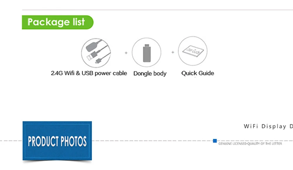 1,Aanycast может использоваться для ЖК/LED телевизора, проектора, монитора с HDMI входом. 2, беспроводной дисплей донгл поддерживает IOS ,Android OS. 3, беспроводной дисплей может отбрасывать содержимое любого Wi-Fi включенного элемента, как телефон/android телефон/планшет на экране телевизора. 4, поддержка Miracast, пока ваше устройство имеет эту функцию. 5, уникальная функция EZcast питается от vsmart, пусть обмен становится легким. 6, поддержка 1080P выходное Название: wifi Дисплей донгл порт: HDMI/USB Особенности: зеркало/передача данных/размер зарядки: 68 мм * 38 мм * 13 мм Материал изделия: зеленый пластик Цвет: черный RAM:DDR 128M
