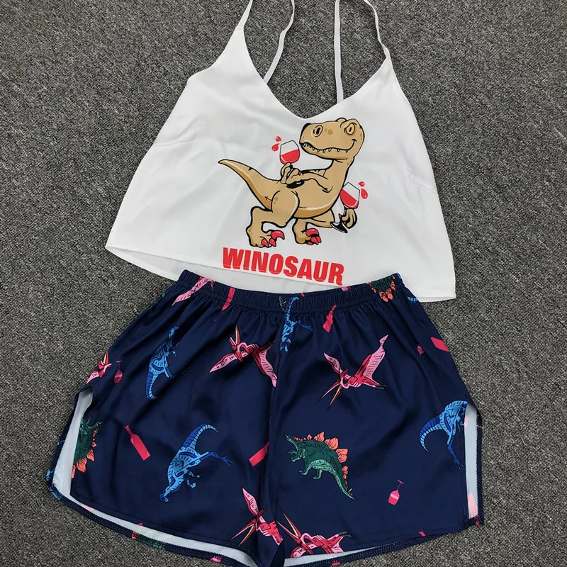 Новые сексуальные пижамы Для женщин пижамный комплект Шелковый домашний костюм с животным принтом летняя V образным вырезом Пижама женский ремень свободного покроя, одежда для сна пижамный комплект