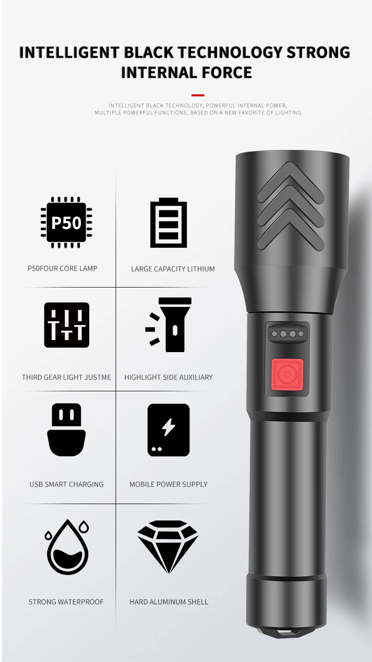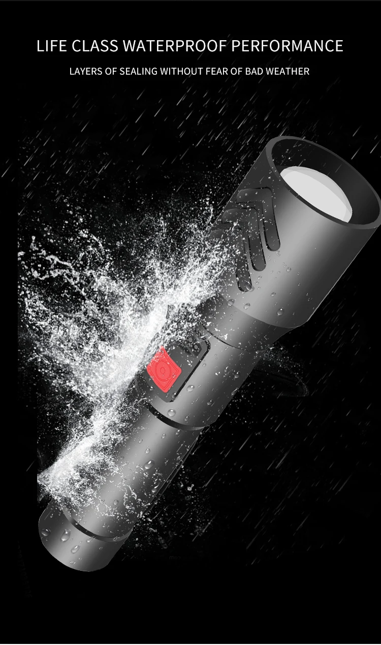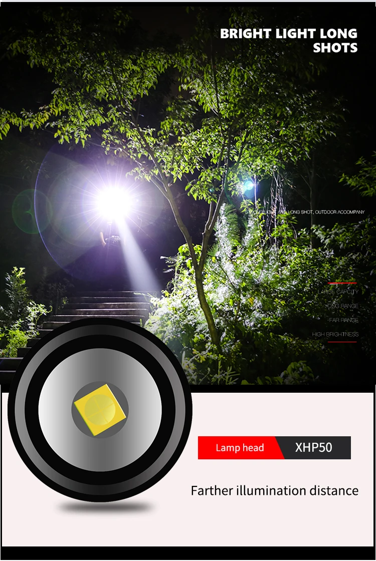 Мощный светодиодный фонарик с использованием лампы XHP50 светодиодный фонарь с максимальным выходом до 50000 люменовУвеличьте встроенный аккумуляторный отсек, чтобы увеличить время работы.Дисплей емкости аккумулятора, телескопический зумМикро-usb для компьютера usb, Автомобильный USB, usb-разъем для зарядки, зарядный фонарикИзготовлен из авиационного алюминиевого сплава прочный HAIII военный класс Жесткий анодированныйВодонепроницаемый в соответствии с IPX-6, водостойкий, может использоваться в дождливую погоду, но не может положить его в водуПодходит для работы, охоты, альпинизма, рыбалки, кемпинга и активного отдыха и т. д.