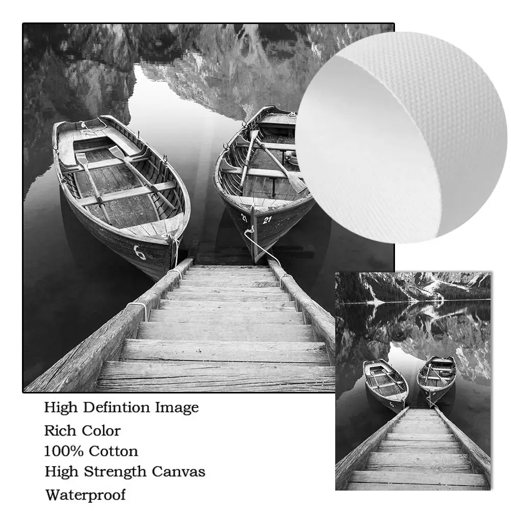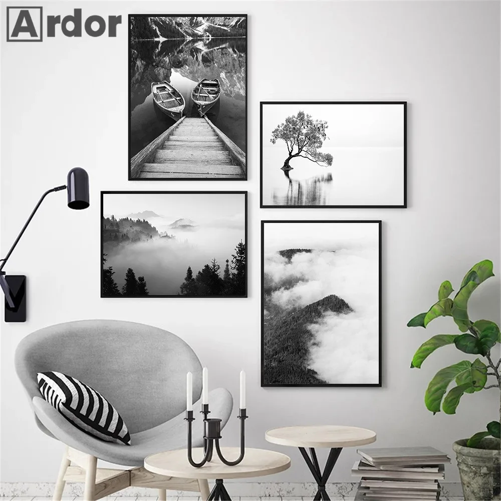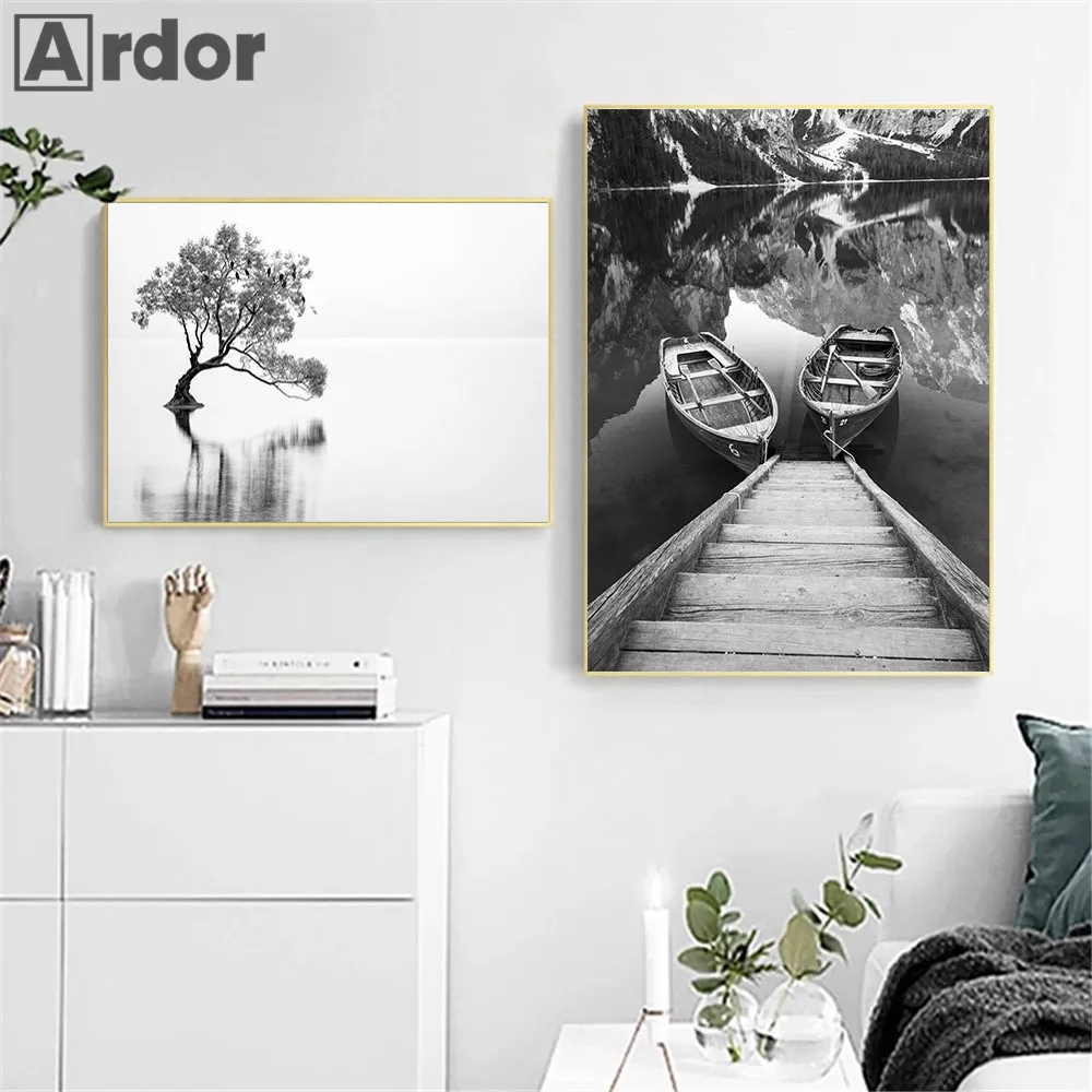 Озерная лодка, натуральная кожа, Фотофон, гора леса, черно-белая Настенная картина, постер, картина, скандинавский рисунок, домашний декор