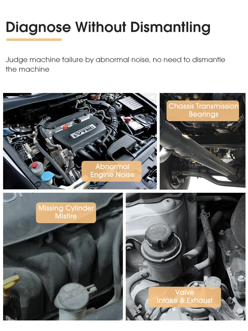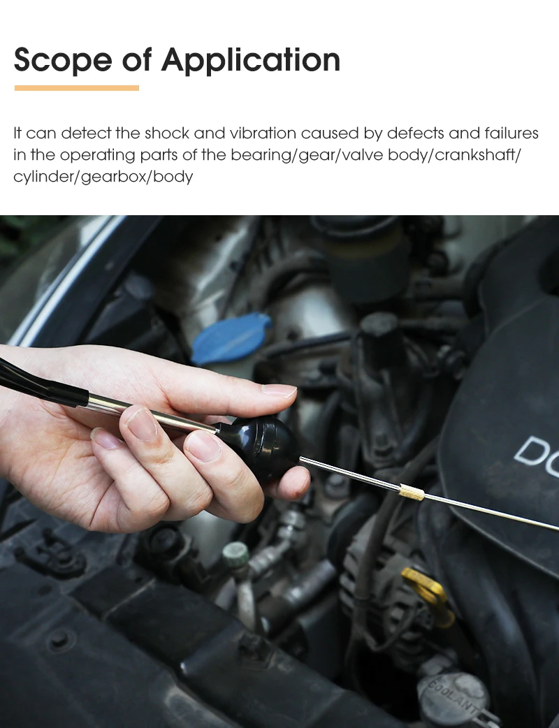 1. Функция: идеально подходит для выявления проблем с двигателем автомобиля, выявления сломанных прокладок, плохих шкивов, поврежденных передач, дефектных клапанов, сбоев водяного насоса и других поврежденных деталей, которые вызывают нечетные шумы и неисправную работу.