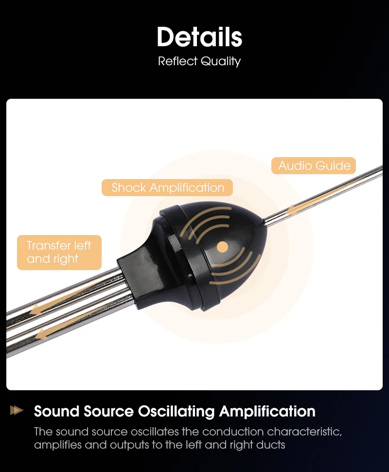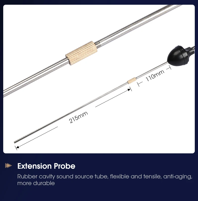 Особенность металлический щуп выдвигается на 350 мм для попадания в замкнутые зоны; Изготовлен из нержавеющей стали, ударопрочного ABS пластика и резины.; Уникальная звуковая камера усиливает звук.; Особенности диафрагмы, помогающей точить Источник шума.; Универсальный инструмент для всех автомобилей.