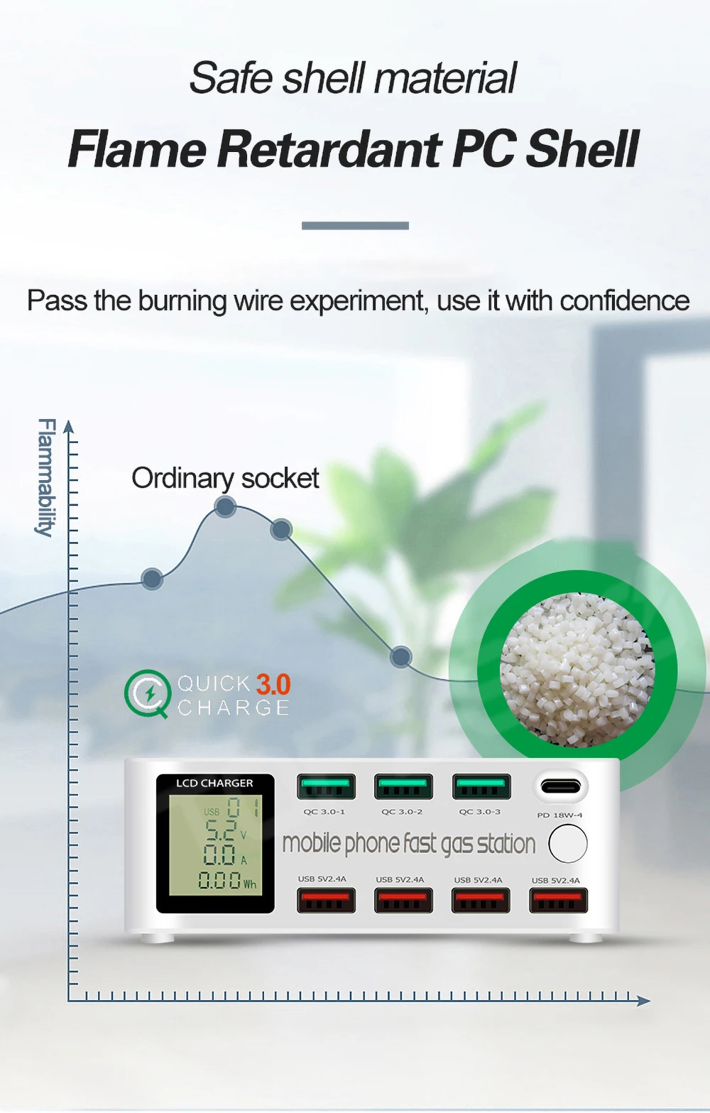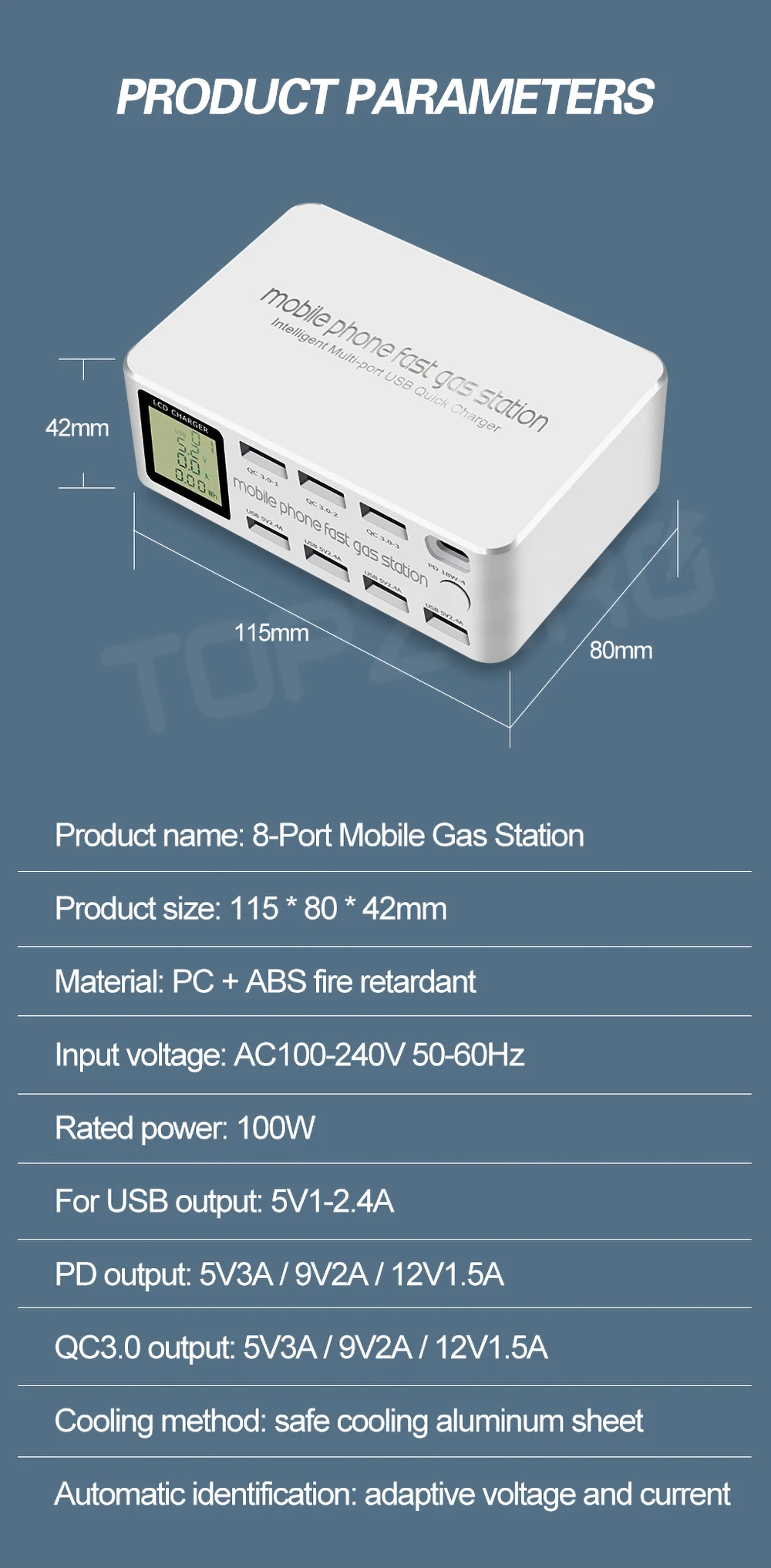 1. С 4 портами USB A, 3 портами QC3.0 и 1 портом PD3.0 2. Совместимость со всеми смартфонами, такими как iphone, Samsung, Xiaomi, Huawei, LG, Lenovo, HTC, Sony, Google и tablet PC, камера, MP3, MP4 плеер, PSP 3. Одновременно заряжайте 8 устройств 4. Автоматическое соответствие тока, больше защиты 5. С интеллектуальным ЖК-цифровым дисплеем