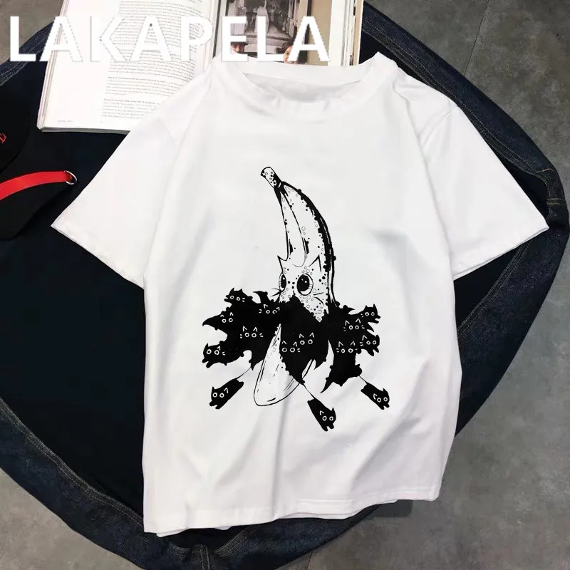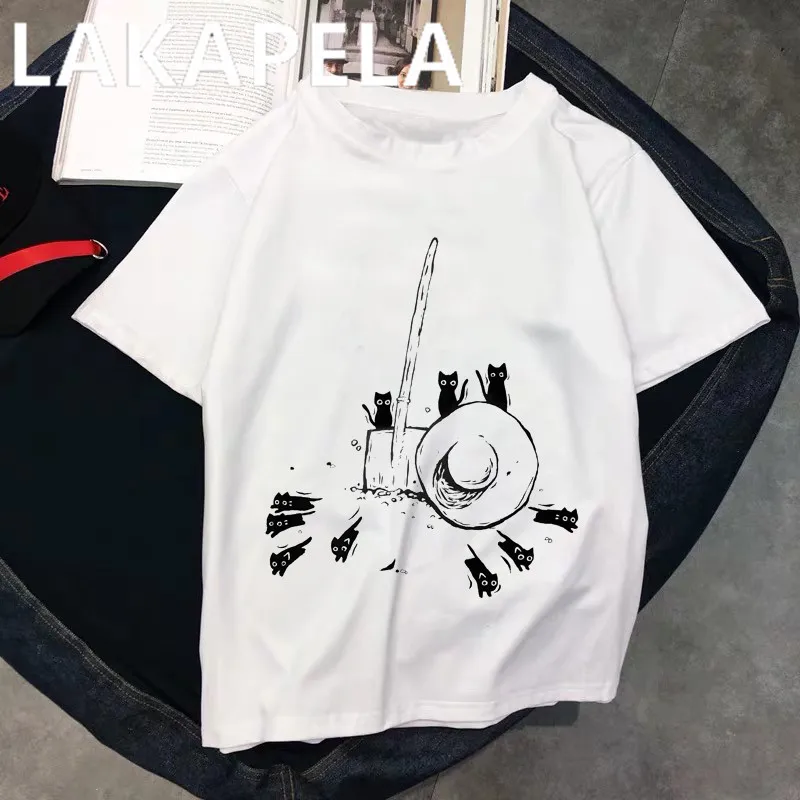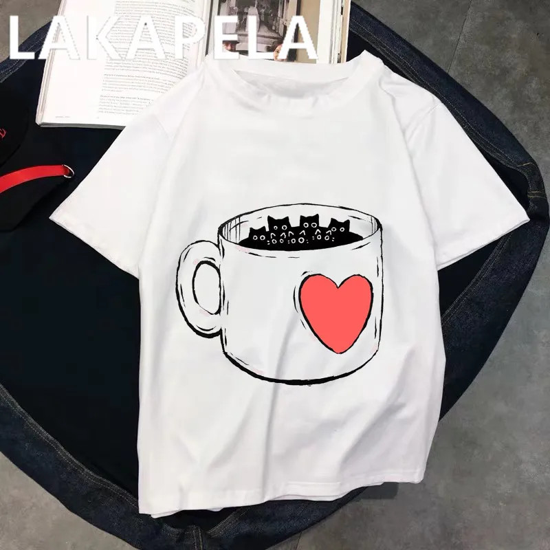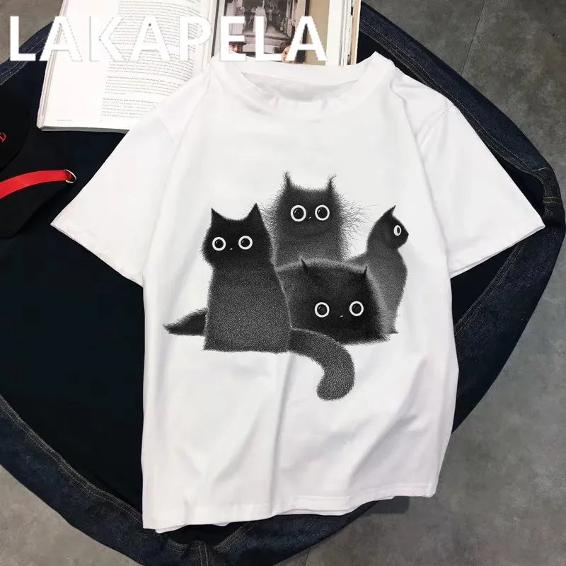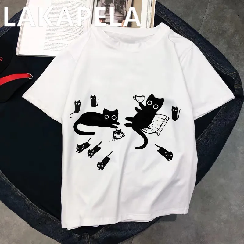 Футболка женская с принтом кошки, милый топ с коротким рукавом, белая рубашка в стиле Харадзюку, топ с круглым вырезом, на лето