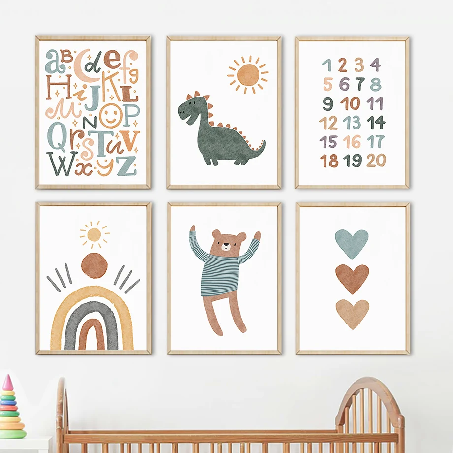 Настенная Картина на холсте мультфильм Медведь динозавр сердце ABC скандинавские плакаты и принты настенные картины для детской комнаты декор для детской комнаты