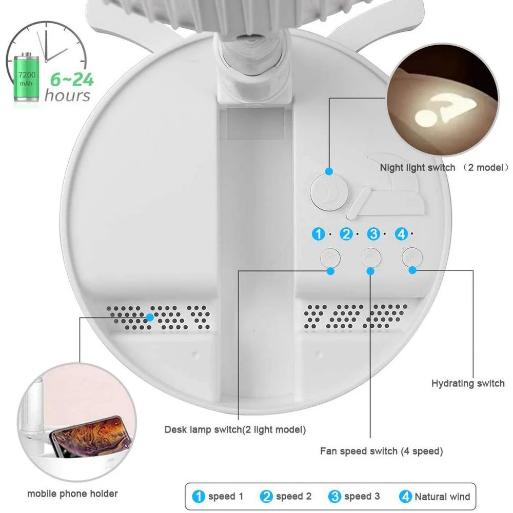 Персональный вентилятор работает на перезаряжаемой батарее 7200 мАч, которая может быть мобильным питанием для вашего телефона, iPad, планшета и умных часов и т. Д.