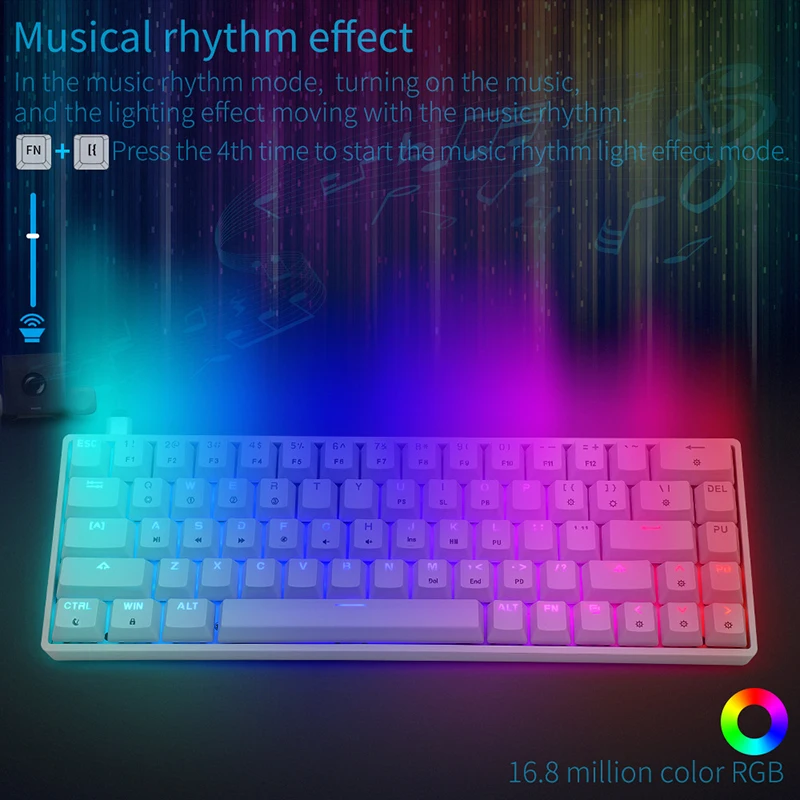 GK68/GK68SGK68:ABS Keycaps/проводное соединение (USB Type C)GK68S:ABS Keycaps/проводное соединение (USB Type C) и беспроводное соединение bluetooth (FN + Space может переключаться между проводным режимом и режимом Bluetooth, литиевой батареей 1900 мАч.)