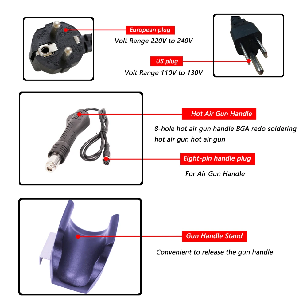 1 × 858D паяльная станция1 × ручка8 × воздушное сопло1 × Кабель питания (штепсельная вилка США/штепсельная вилка европейского стандарта)1 × обогреватель