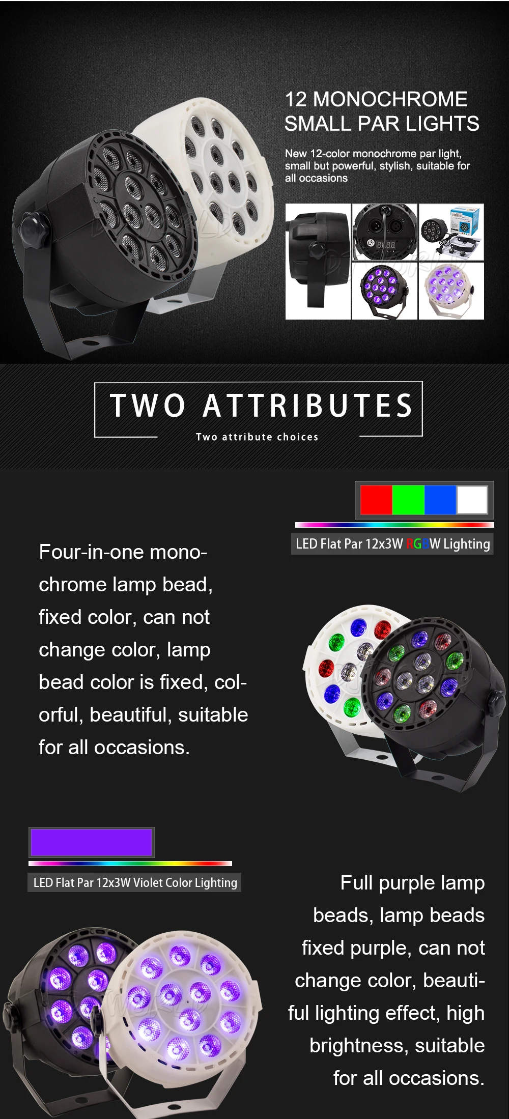 Входное напряжение: AC90--240V,50-60 чПотребляемая мощность: 36 ВтСветодиодный источник: 12x3WЦвет: 1. Красный, зеленый, синий, белый 2. Фиолетовый цветРежимы работы: DMX512, автоматический запуск, звуковое действие, стробоскоп, автономный и мастер/раб, с богатыми передовыми встроенными программамиУгол луча: 15 градусовСтруктура материала: высокая термостойкость пластик, черный или белый boby может выбратьДлительный срок службы светодиода (более 60000 часов)Размер изделия: 12x12x9 смПродукт Вес: 0,35 кгСертификат: CE & ROHS & UL & SA