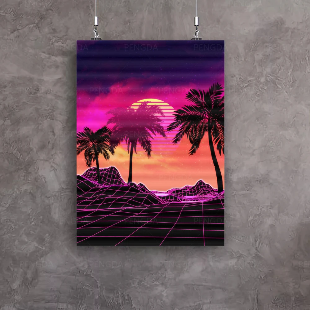 Модульные картины Сумерки на холсте картина Synthwave тропический пейзаж настенный плакат неоновый Декор для дома рамка для гостиной