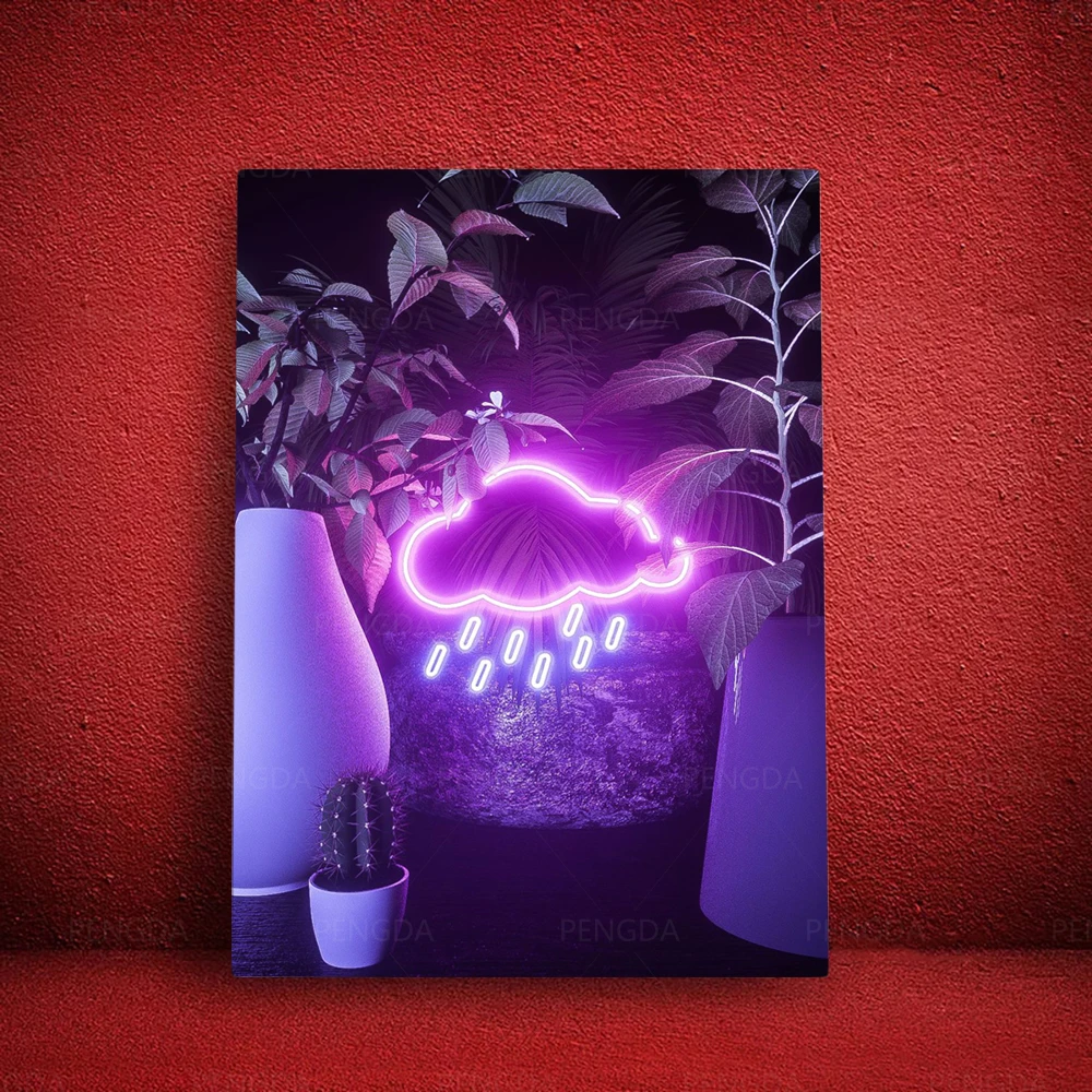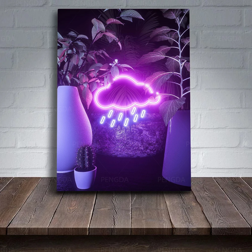 Модульная холст неоновый светильник Фото Картина Дождь принты для домашнего декора Retrowave плакат современные облако Wall Art Для Гостиная рамка