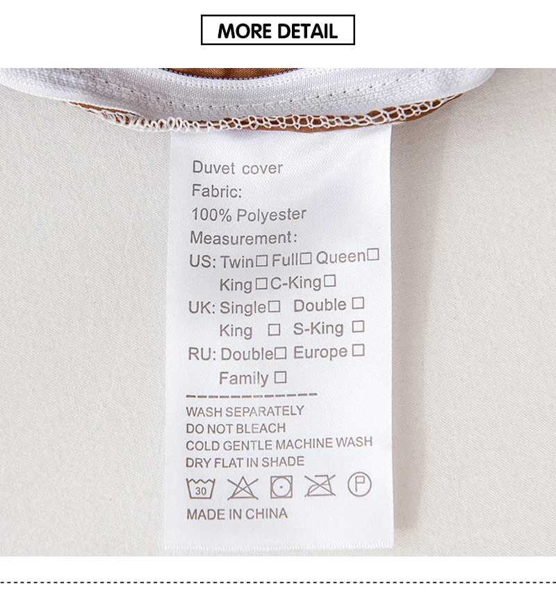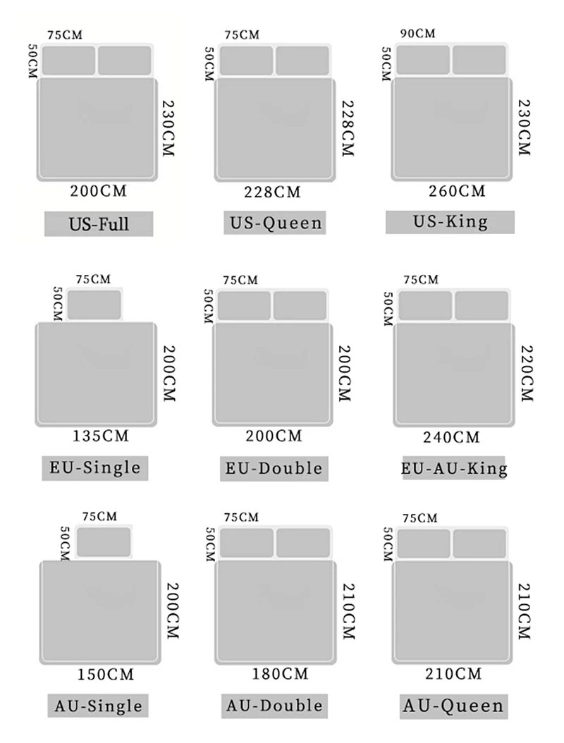 US-Twin(2 шт.) =Пододеяльник: 168*229 см * 1, чехол для подушки: 50*75*1;US-Full(3 шт.) =Пододеяльник: 200*230 см * 1, наволочки: 50*75*2;США-Королева (3 шт.) =Пододеяльник: 228*228 см * 1, наволочки: 50*75*2;US- King(3 шт.) =Пододеяльник: 260*230 см * 1, наволочки: 50*90*2;ЕС-одиночный (2 шт.) =Пододеяльник: 135*200 см * 1, чехол для подушки: 50*75*1;ЕС-Double(3 шт.) =Пододеяльник: 200*200 см * 1, наволочки: 50*75*2;EU-AU-King(3 шт.) =Пододеяльник: 240*220 см * 1, наволочки: 50*75*2;AU-Single(2 шт.) =Пододеяльник: 150*200 см * 1, чехол для подушки: 50*75*1;AU-Double(3 шт.) =Пододеяльник: 180*210 см * 1, наволочки: 50*75*2;AU-Queen(3 шт.) =Пододеяльник: 210*210 см * 1, наволочки: 50*75*2;
