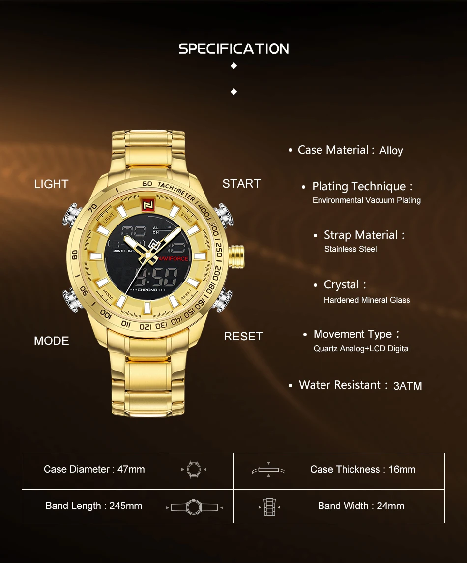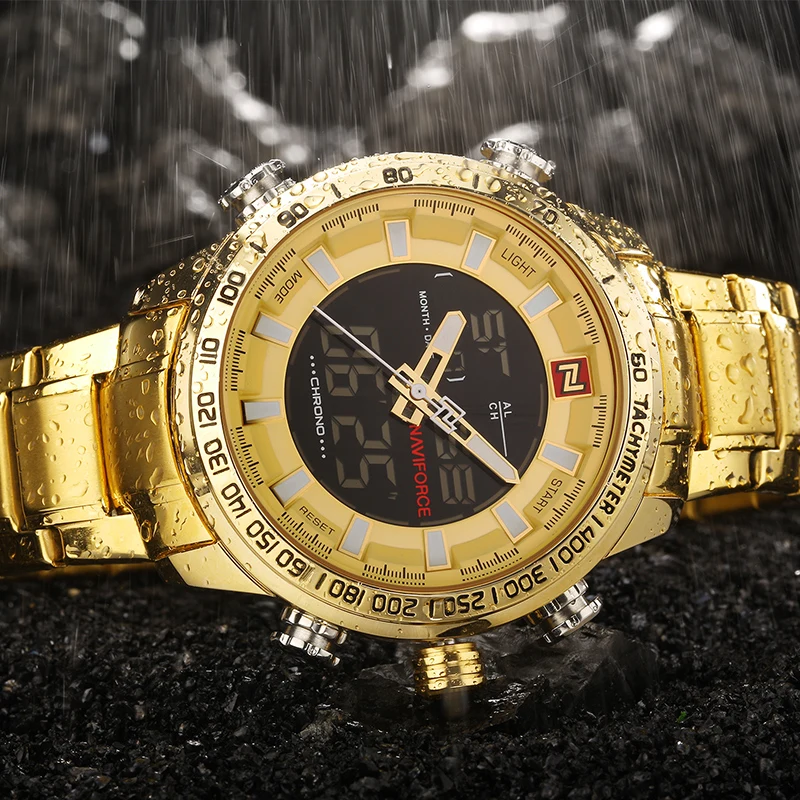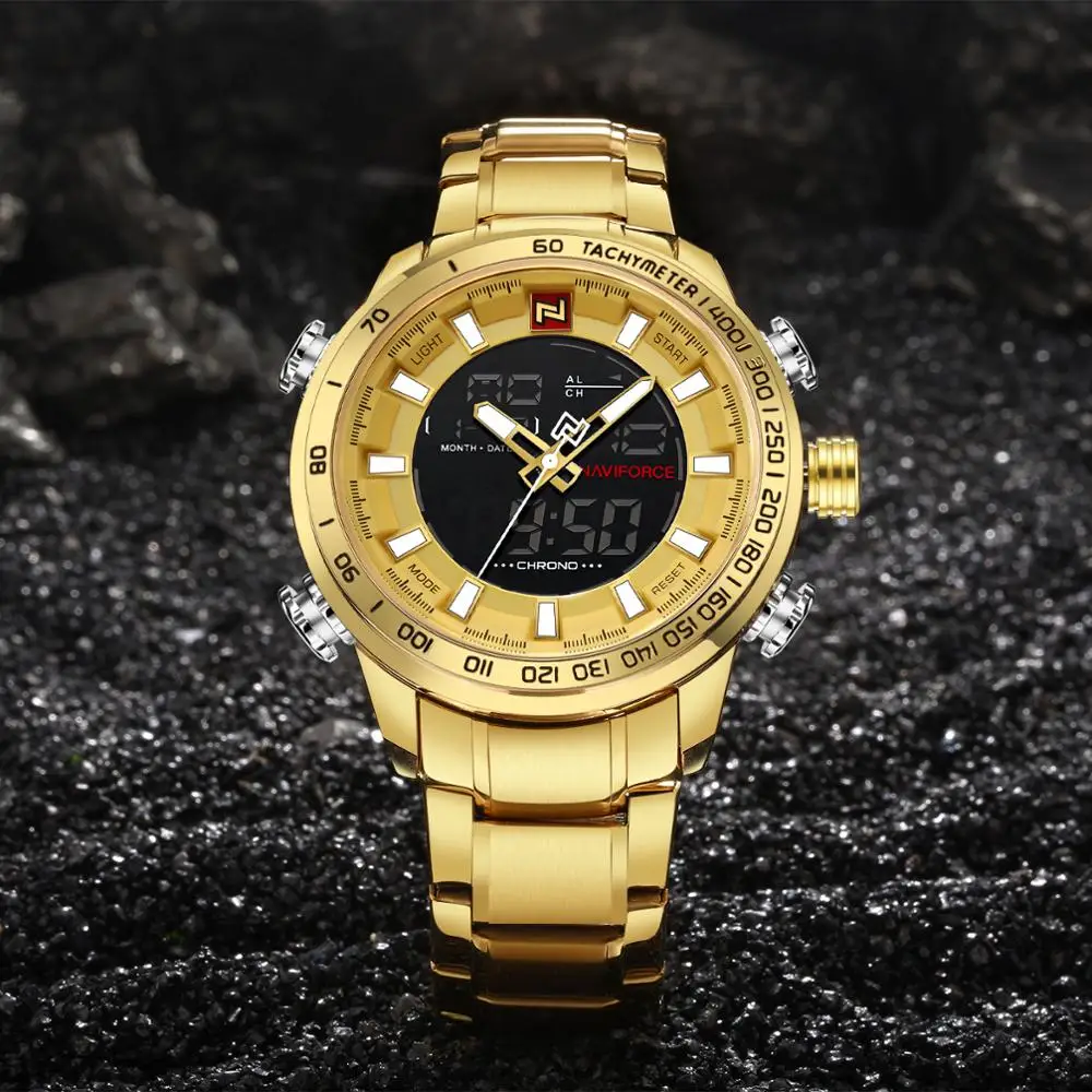 Часы наручные NAVIFORCE Мужские кварцевые, Модные Военные Спортивные Водонепроницаемые золотистые стальные, с двойным дисплеем