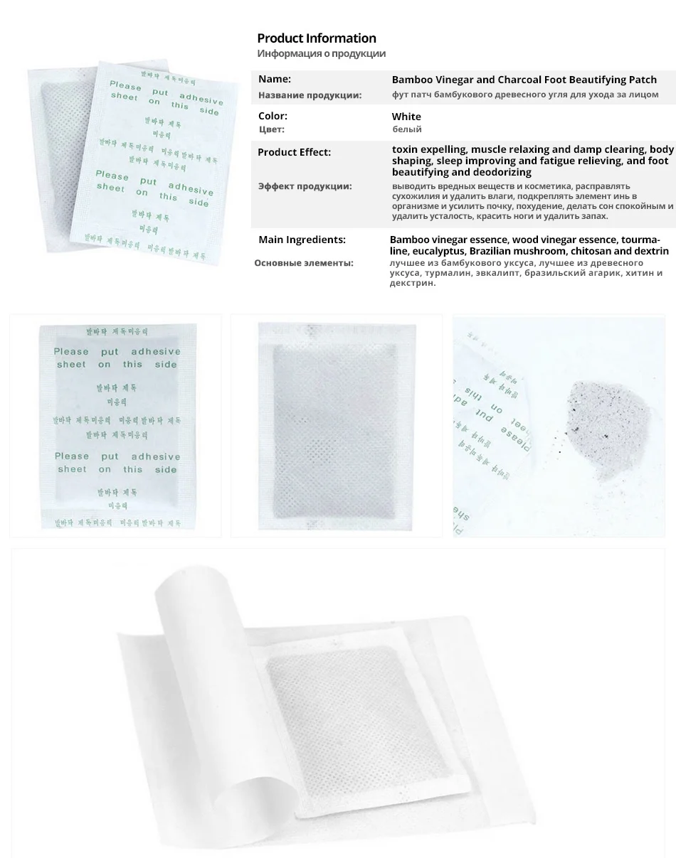 1 партия = 100 шт = 50 шт пластырей (25 небольших упаковок) + 50 шт клеевСостав: бамбуковый уксус, хитозан, декстрин, докудами, лист локата, турмалин, растительное волокно, витамин С и древесный уксус. Подушечки индивидуально обернуты для сохранения свежести.Преимущества ботинок для ног:Высвобождение нежелательных токсиновУвеличьте уровень энергииУменьшает боль, боли, головные боли и усталостьСнятие стрессаУлучшает обмен веществУлучшить ваше кровообращениеУлучшение потери весаПолностью сдержанный-работает во время снаПростой и простой в использованииУказания для использования:1. Нанесите пластырь Kinoki detox за час до кровати.2. Вымойте и высушите ноги или часть тела перед нанесением пластырей kinoki Detox.3. Возьмите один клейкий лист и Медленно снимите бумагу.3. Поместите ножную подкладку на клейкую поверхность, чтобы «положить клейкий лист на эту сторону» и поместите на подошву вашей стопы или на желаемую область другой части тела.(Носки можно носить при необходимости)4. Носите в течение 8-10 часов, затем удалите коврик.5. Протрите поверхность влажным полотенцем, пока оно не станет липким.6. Использованные пластыри будут выглядеть темно-зеленоватыми или сероватыми, так как они поглощают токсины и отходы от вашего тела.7. Продолжайте использовать каждую ночь до тех пор, пока не исчезнет обесцвечивание подкладки.8. При использовании пластырей kinoki появляются признаки осветления, применяйте один или два раза в неделю для обслуживания.Предостережения: Не надевайте рану. Если у вас аллергия, не используйте эти подушечки. Этот продукт не предназначен для диагностики или лечения любых заболеваний. Если у Вас возникли какие-либо заболевания, обратитесь к врачу.