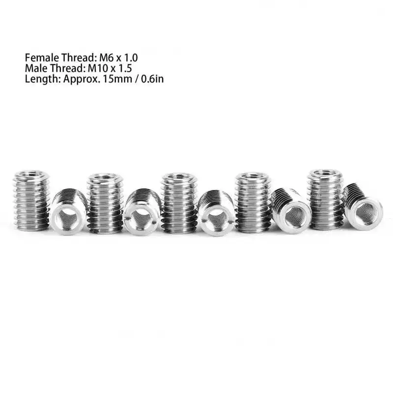 Тип изделия: вставная гайкаМатериал: 303 нержавеющая стальСпецификация резьбы:Женская нить: M6 x 1,0Наружная резьба: M10 x 1,5Длина: прибл. 15 мм/0,6 дюймаДолота: маленький слотПрименение: Ремонт резьбыЧехол: например, если нить M8 скользкая, если вы хотите продолжать использовать нить M8 после восстановления, используйте эту гайку для ремонта, чтобы сначала расширить резьбу M8 на резьбу M10, а затем используйте редуктор длины M8-M10-12, чтобы изменить ее на M8, Так как материал этого уменьшающего диаметра-нержавеющая сталь, это сделает резьбу M8 более прочной.