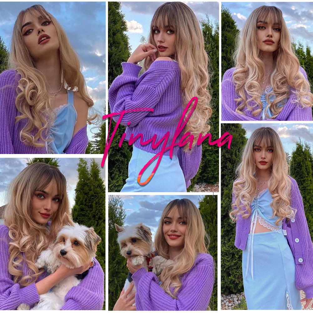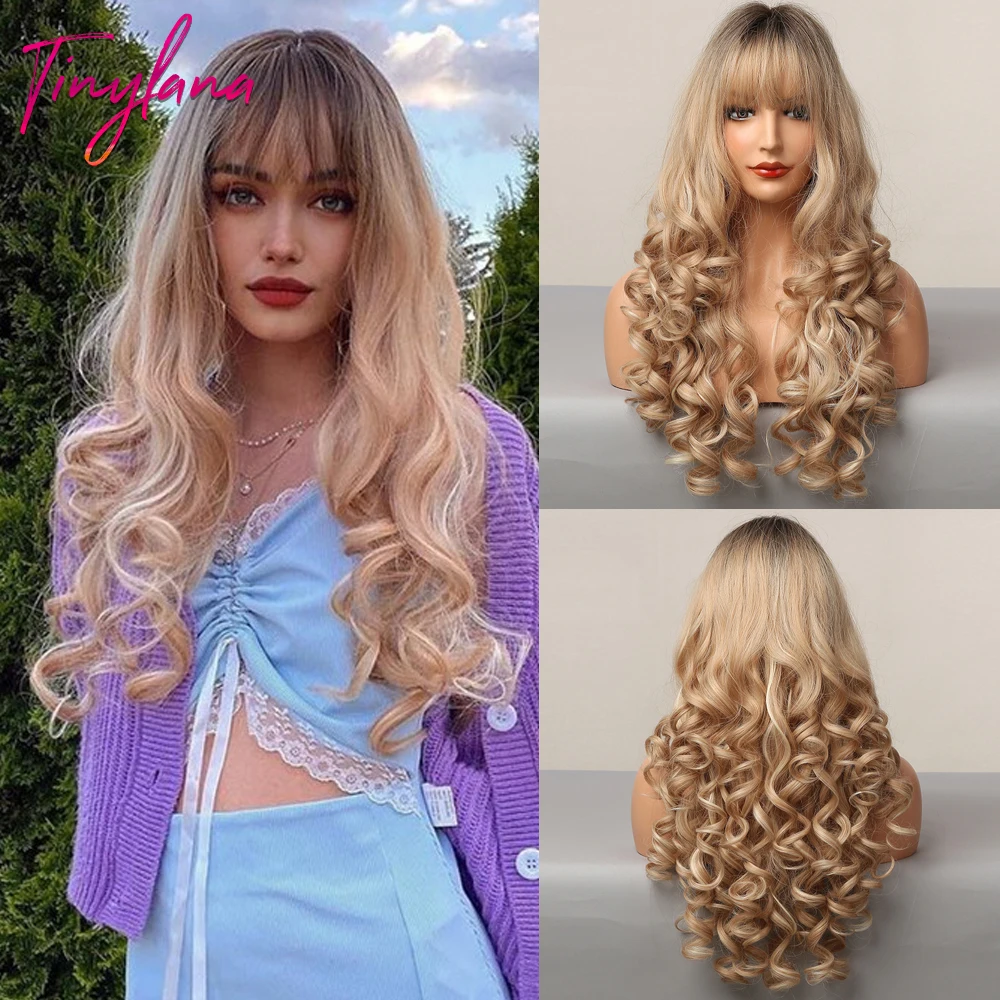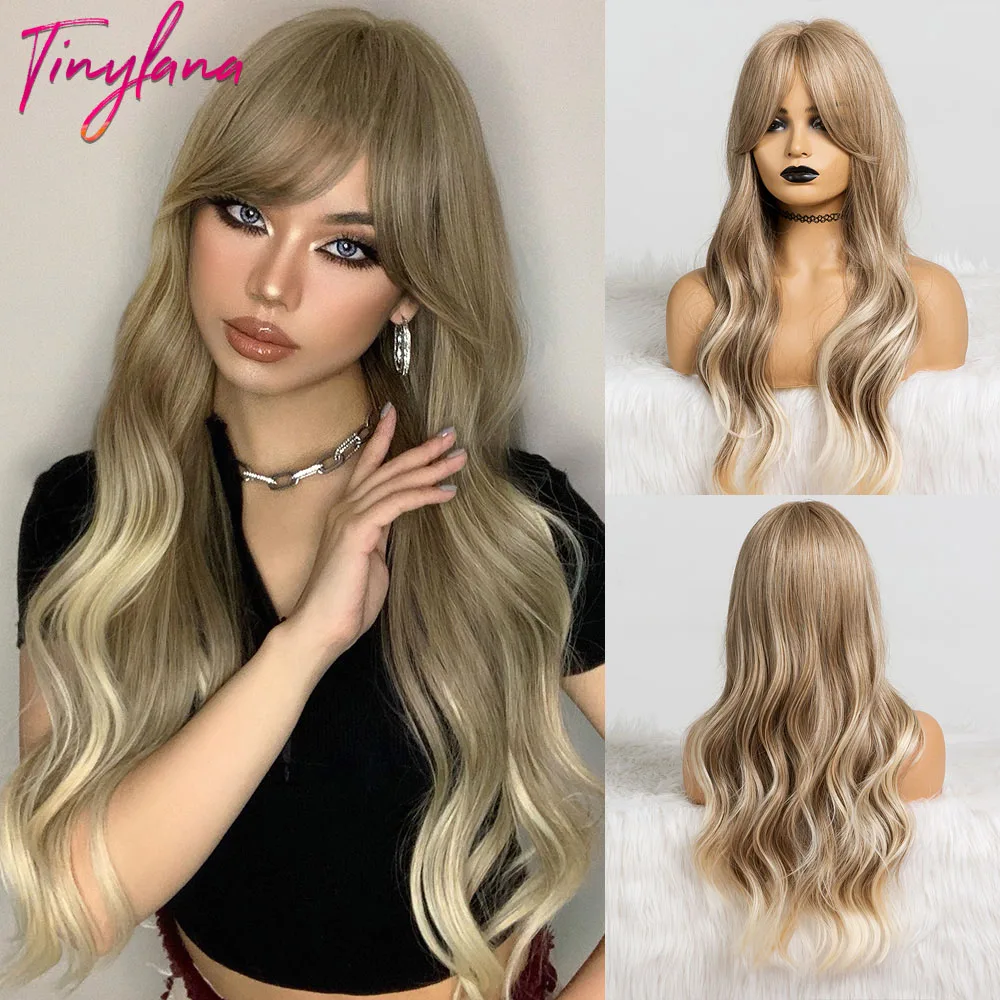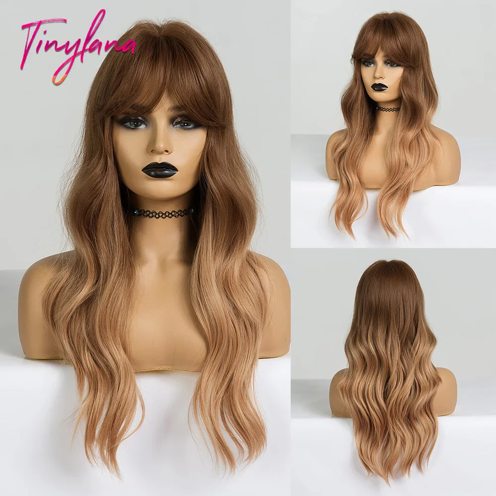 Длинный волнистый синтетический парик с челкой для женщин, Омбре, коричневый, светлый, хайлайтер, парики с глубокой волной, косплей, ежедневный, натуральный, термостойкий