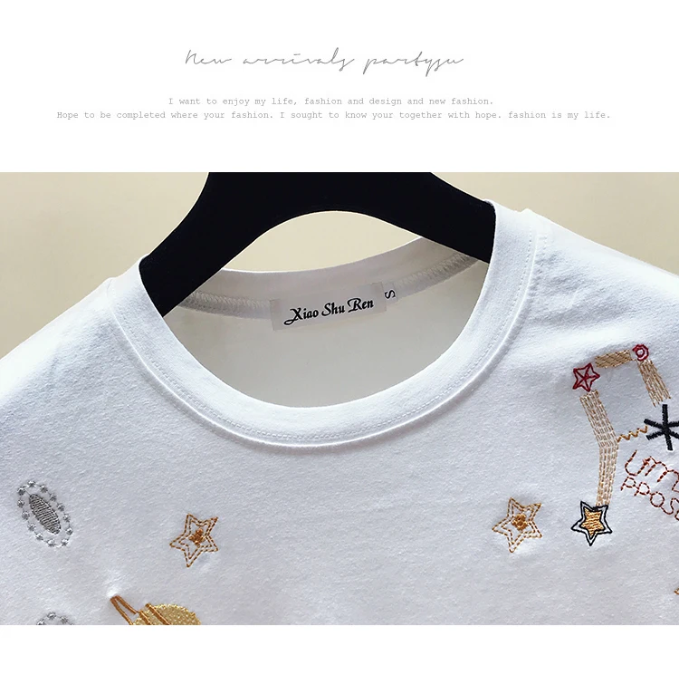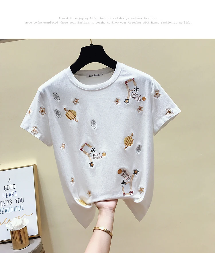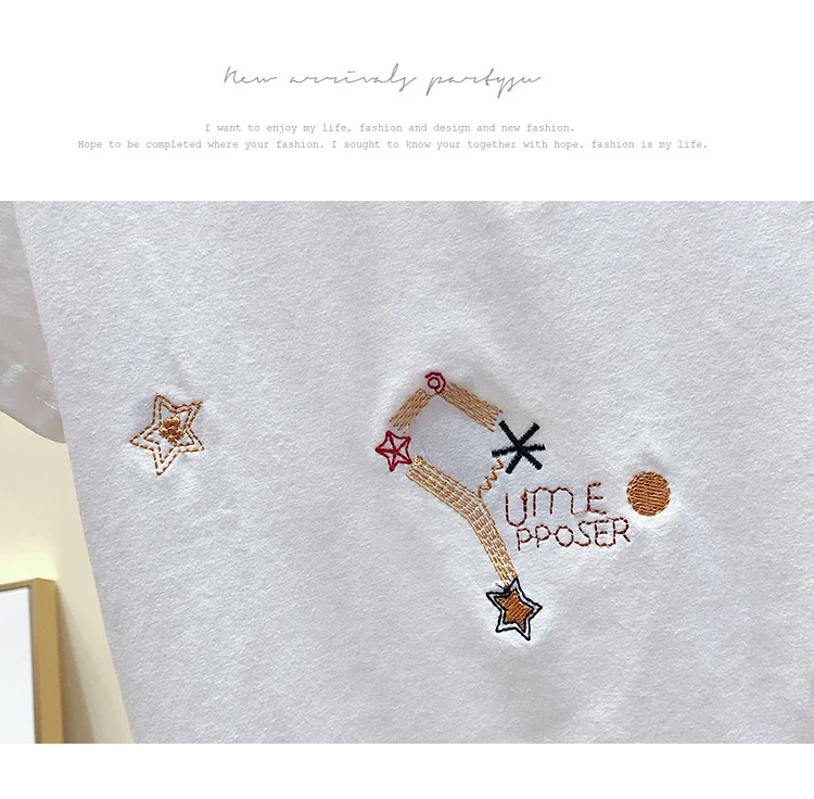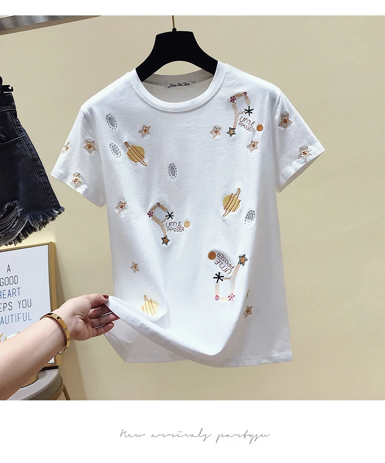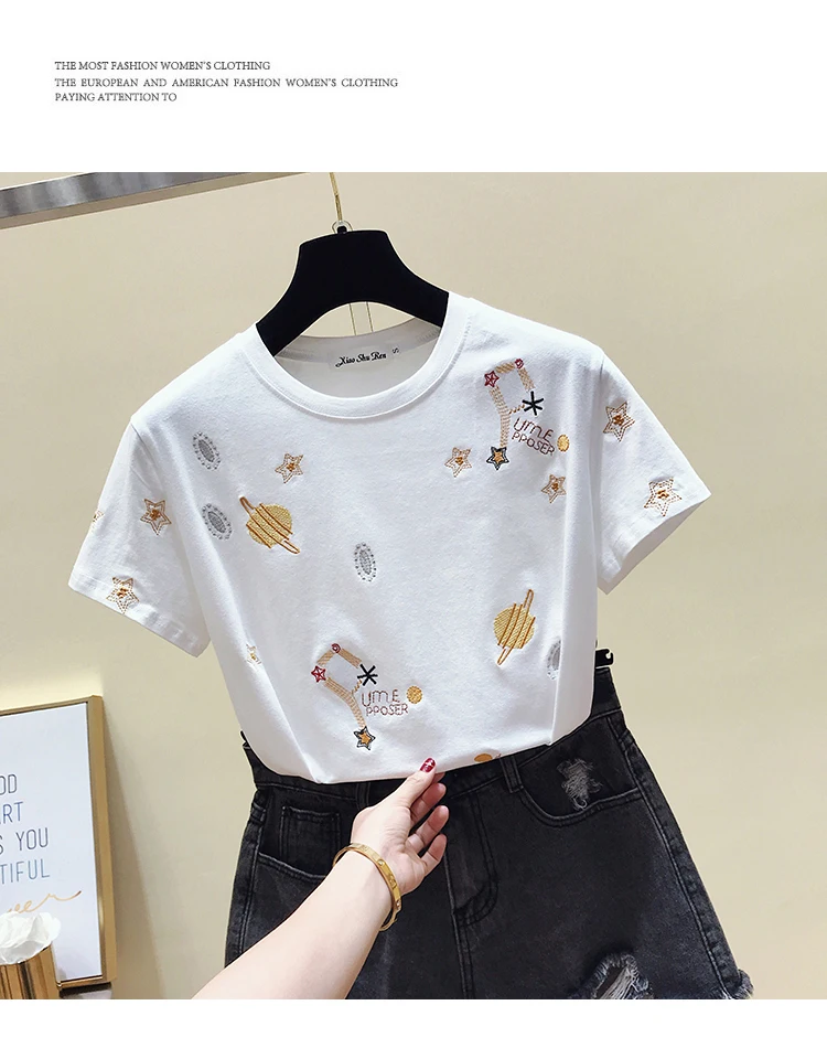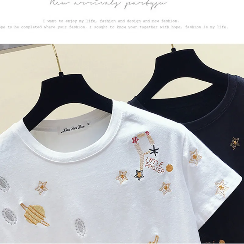 Футболка женская хлопковая с вышивкой в виде звезд, модный топ с коротким рукавом, винтажная Свободная Повседневная рубашка, цвет белыйчерный, на лето
