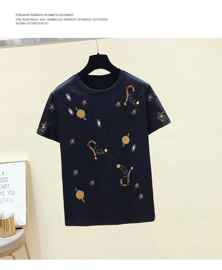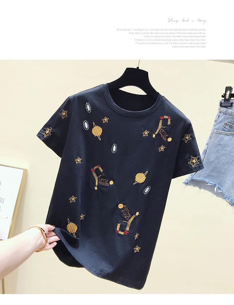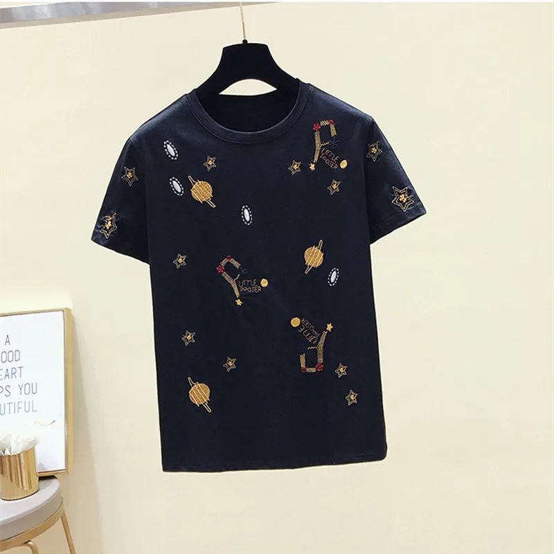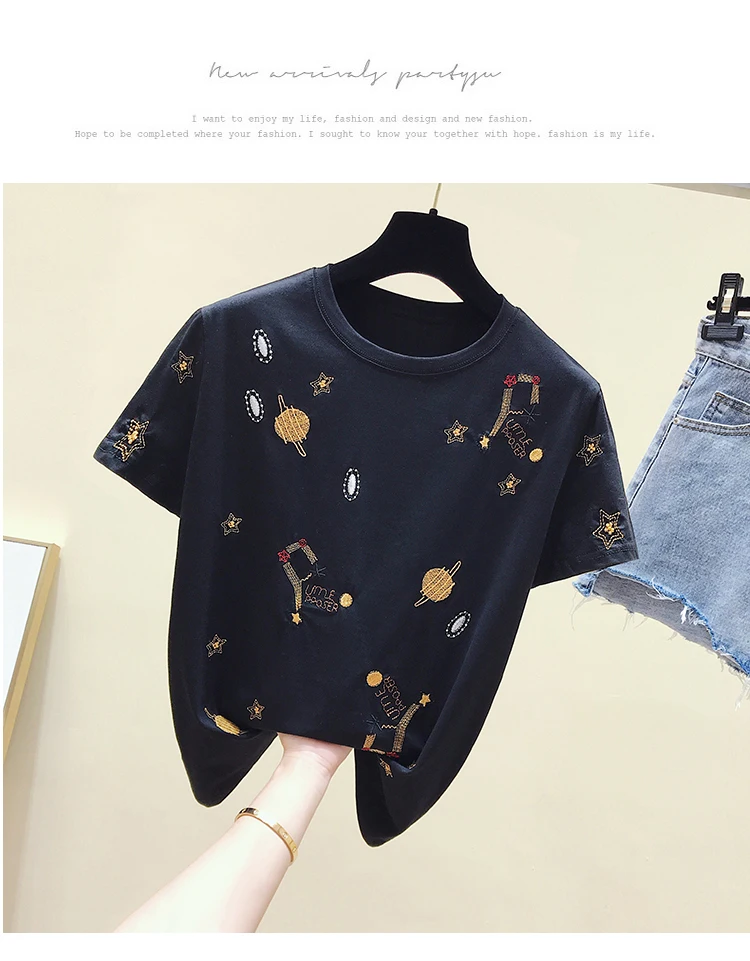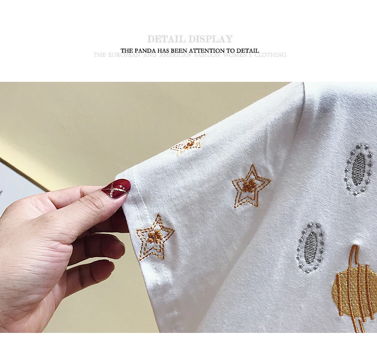 Футболка женская хлопковая с вышивкой в виде звезд, модный топ с коротким рукавом, винтажная Свободная Повседневная рубашка, цвет белыйчерный, на лето