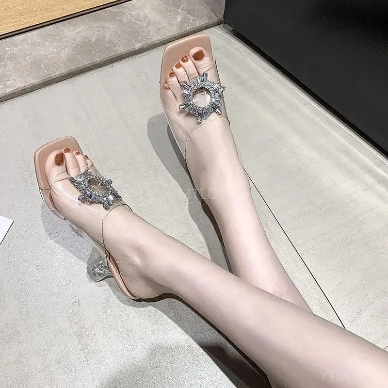 Сандалии женские прозрачные на высоком каблуке, ПВХ, квадратный носок, пряжка, кристаллы, Подсолнухи, летняя обувь