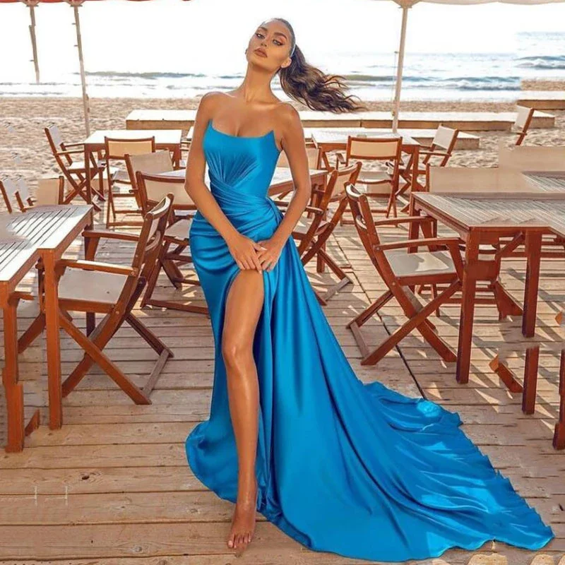 Сексуальное синее вечернее платье без бретелек Русалка с длинным высоким бортом платье с разрезом для выпускного вечера Новое поступление Платья знаменитостей Дубай вечерние платья