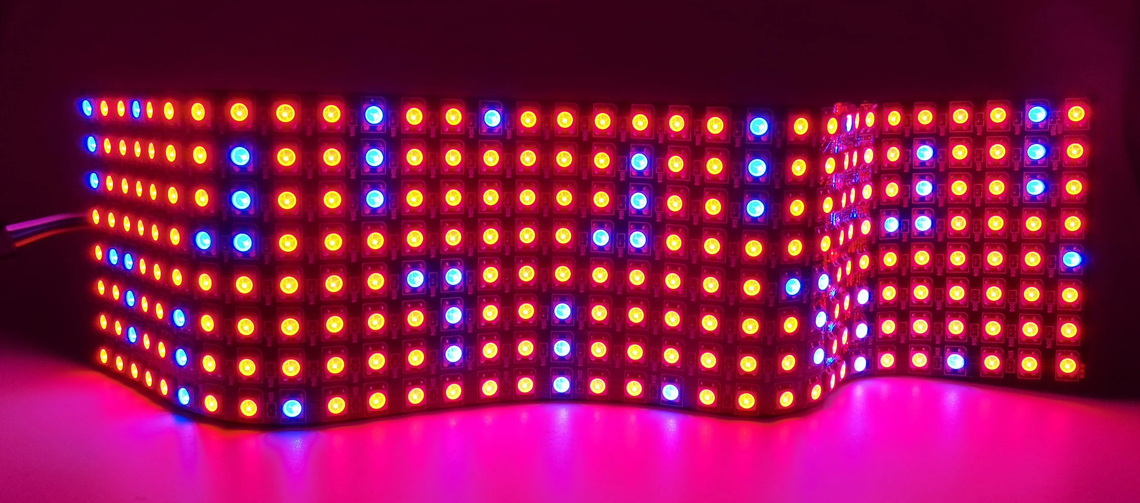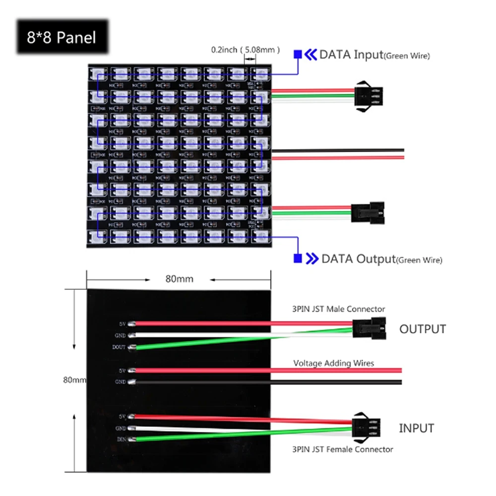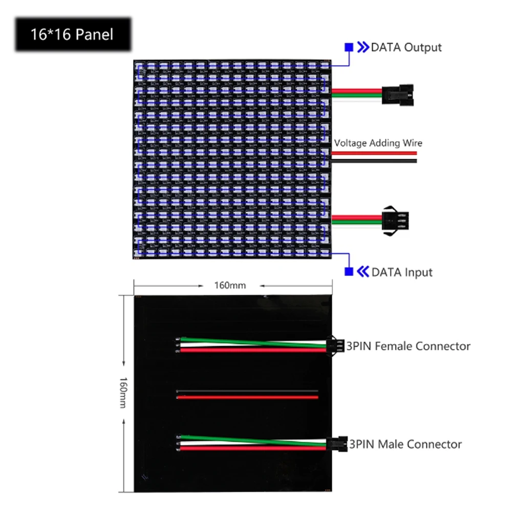 Изготовление светодиодного экрана, светодиодной стены, рекламной доски. Применяется в гостиницах, KTV, барах, рекламных компаниях, отделочных компаниях, городском освещении, развлекательных и развлекательных местах.1. Цвет излучения: пиксель RGB , IC WS28122. Рабочее напряжение: DC5V3. Мощность: 0,3 W/pixel4. Уровень водонепроницаемости: не водонепроницаемый5. Режим работы: внешний контроллер Arduino совместим.6. Подключение: VCC: красный; GND: черный/белый; DAT: синий