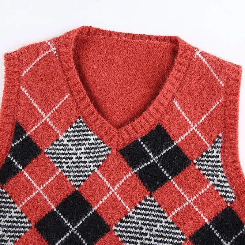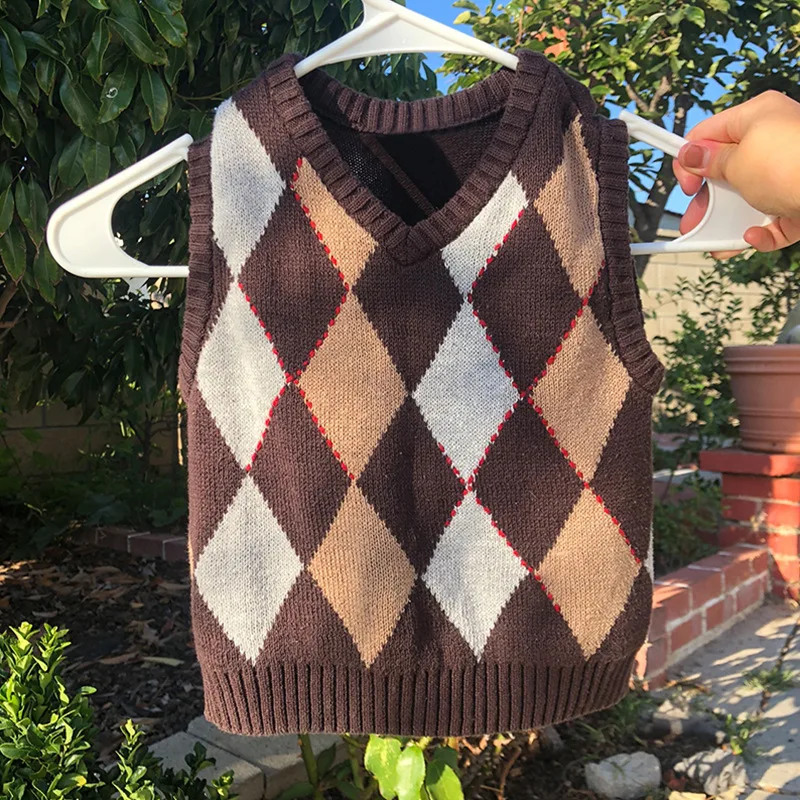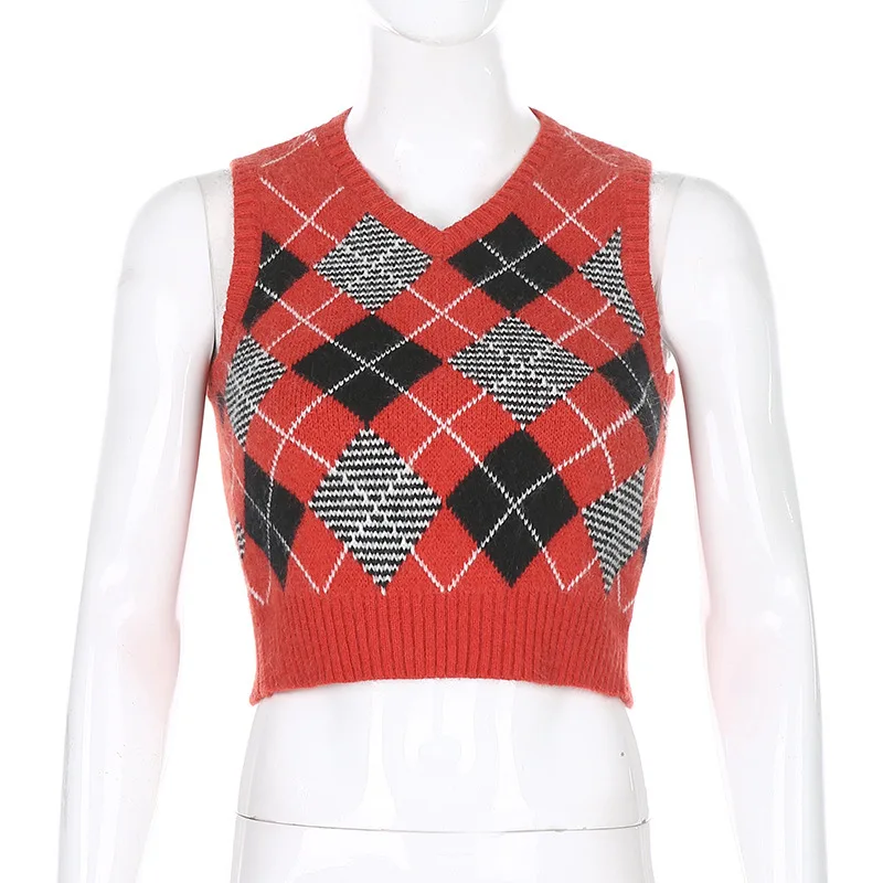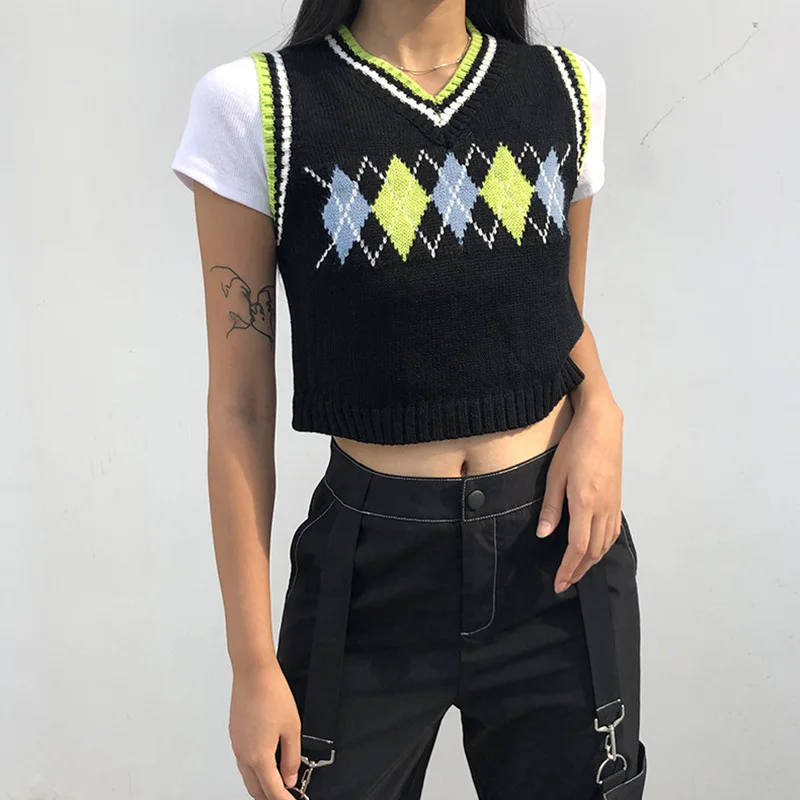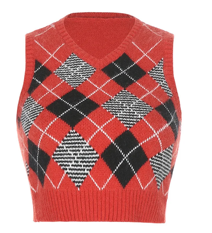Женский винтажный свитер с узором ромбиками, черный клетчатый трикотажный короткий свитер без рукавов, повседневный осенний Топ в стиле преппи, 2021, 2021