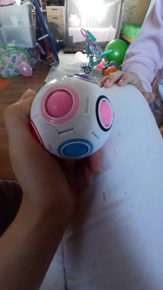 Мячик для детей постарше 3 лет ..сложно менять шарики очень маленький я размеры не учла совсем .но доставка очень быстро пришла это супер )