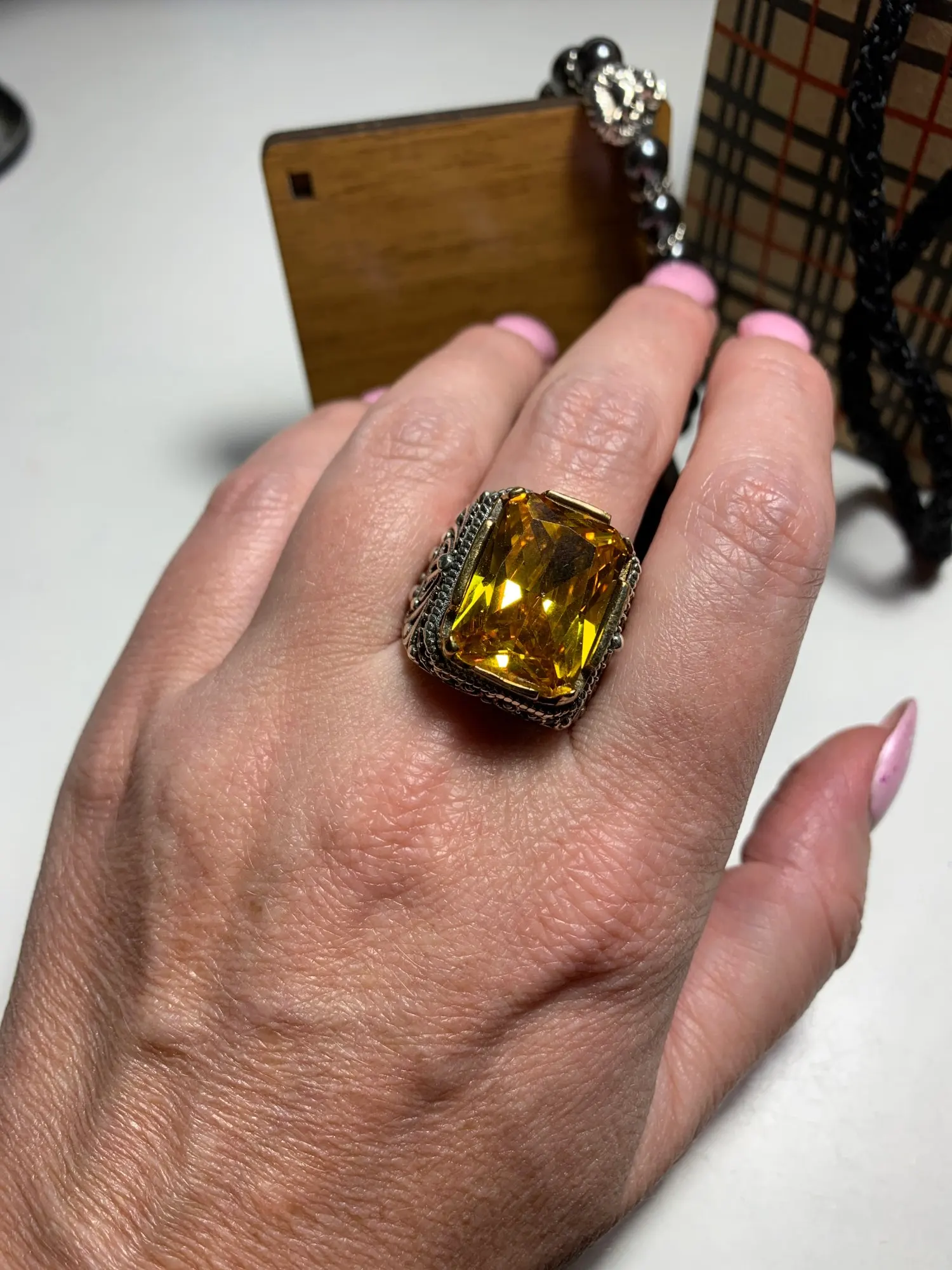 Перстень хорошо выполнен. в стиле старины. дошло быстро. камень относительно основной части кажется высоким чересчур (если ниже то супер). грани окружности немного островаты можно было бы обработать лучше.